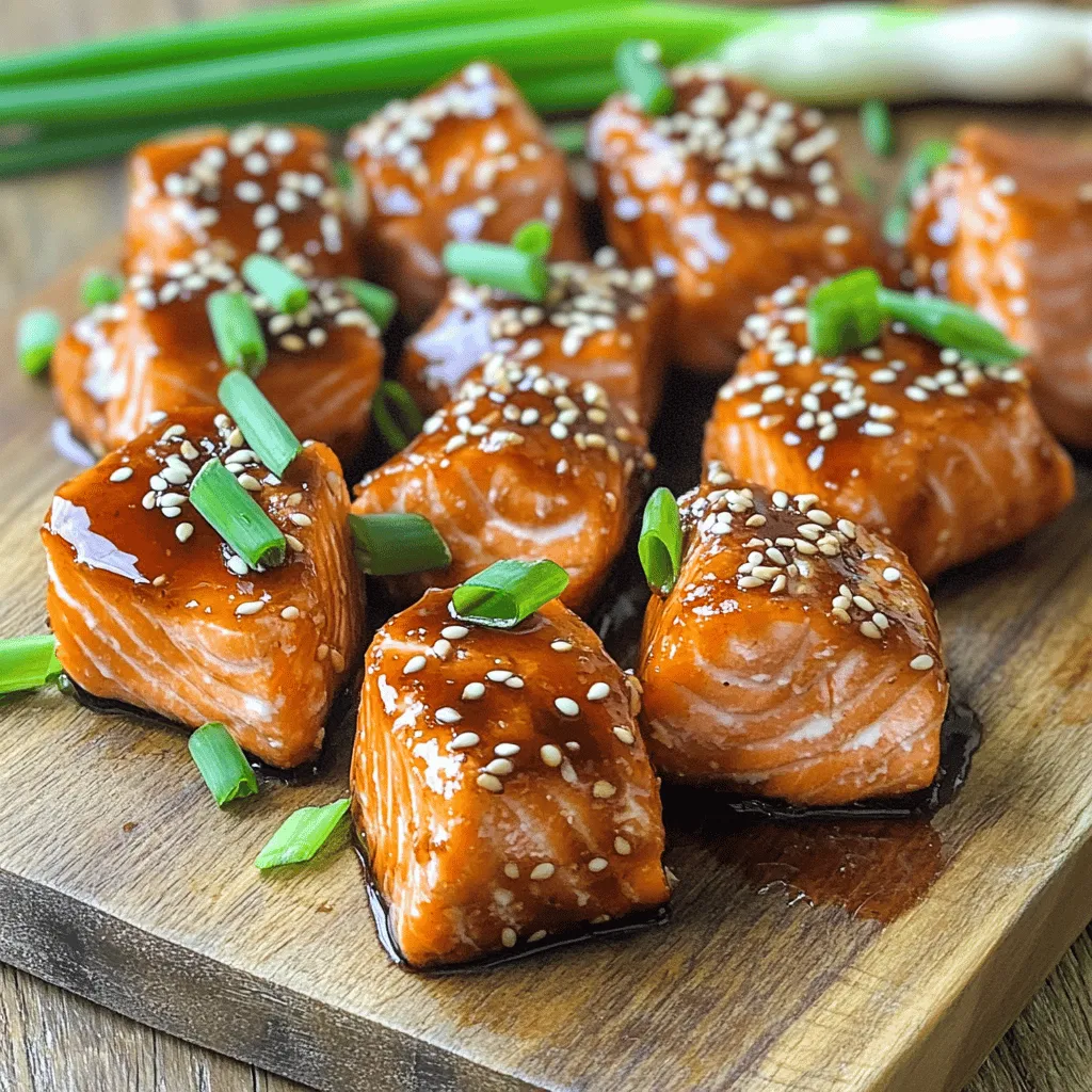 Make your dish pop with a beautiful presentation. Use a white plate to highlight the vibrant colors of the salmon. Arrange the bites in a circular pattern for an appealing look. Drizzle extra marinade over the top for shine. Add a sprinkle of sesame seeds and green onions for color. Serve with a side of rice or steamed veggies for a complete meal. Enjoy the compliments from your friends and family!
