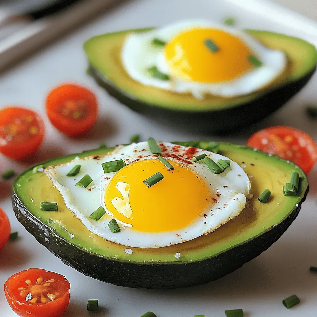 - 2 ripe avocados - 4 large eggs - Salt and pepper to taste - 1 tablespoon olive oil - 2 tablespoons fresh chives, chopped - 1/2 teaspoon smoked paprika - Cherry tomatoes, halved (for garnish) When you gather your ingredients, pick ripe avocados. They should yield slightly when you press them. Fresh eggs make a big difference too. Use large eggs for the best fit in the avocado halves. Don't forget the salt and pepper. These simple seasonings will enhance all the flavors. - Calories: 420 - Protein: 18g - Fats: 36g - Carbs: 18g This meal packs a nutritional punch. Avocados provide healthy fats, while eggs add protein. Together, they form a well-rounded breakfast that keeps you full. Nutritional benefits of avocados Avocados are rich in monounsaturated fats. These healthy fats support heart health. They also contain fiber, which aids digestion. Plus, avocados are loaded with vitamins like E and K. Health advantages of eggs Eggs are a great source of protein. They contain all nine essential amino acids. Eggs also provide choline, which is good for brain health. Eating eggs can help you feel full longer. 1. Preheating the oven: Start by preheating your oven to 425°F (220°C). This is the right temperature for baking the eggs in your avocado boats. Preheating ensures an even cook. 2. Preparing the avocados: Take two ripe avocados. Cut them in half and remove the pit. If the hole isn’t deep enough, scoop out a little flesh from the center. This gives the egg enough space. Place the avocado halves in a small baking dish. You may need to use crumpled aluminum foil to keep them stable. 1. Baking time and temperature settings: Place the prepared avocados in the oven. Bake them for about 15 to 20 minutes. The time will depend on how you like your eggs. Less time gives you runny yolks. More time will make them firm. 2. Tips for achieving desired egg doneness: Keep an eye on your eggs. If you want them runny, check at the 12-minute mark. For firmer yolks, let them bake longer. Remember, eggs will continue to cook a bit after you take them out. 1. How to garnish the dish: Once baked, it’s time for the finishing touches. Remove the avocado boats from the oven. Sprinkle chopped chives over them. You can add salt and pepper for extra flavor. 2. Serving suggestions: Garnish with halved cherry tomatoes. They add a fresh pop of color and taste. Serve the avocado egg boats warm, maybe with toast or a simple salad on the side. Enjoy your meal! To make your avocado egg breakfast boats perfect, timing is key. You can adjust the baking time based on how you like your yolks. If you want runny yolks, bake for about 15 minutes. For firmer yolks, let them bake for 20 minutes. Choosing ripe avocados is also very important. Ripe avocados are soft to the touch. They will hold the egg well and taste great. If your avocados are not ripe, they will not work as well. You will need a few simple tools to create these tasty boats. A baking dish works best to hold the avocados steady. A spoon helps to remove any extra egg white. Sometimes, avocado halves can tip over. You can stabilize them with crumpled aluminum foil. Just place the foil in the baking dish to support the avocado halves. This step keeps everything in place while baking. Get creative with your breakfast boats! You can add cheese or fresh herbs for more flavor. Cheese like feta or cheddar melts wonderfully over the egg. Fresh herbs like basil or parsley add a nice touch as well. Seasoning is also fun to change up. If you want a kick, try adding chili flakes or a dash of hot sauce. For a different taste, use garlic powder or onion powder. The options are endless! {{image_2}} You can change the ingredients in your avocado egg breakfast boats. Try using different veggies or proteins. For a fresh crunch, add bell peppers or spinach. These will boost flavor and nutrition. If you want a vegan version, swap the egg for tofu. Use silken tofu for a creamy texture. You can also add nutritional yeast for a cheesy flavor. This keeps the dish tasty without eggs. Make your breakfast boats special with different themes. For a Mediterranean style, add feta cheese, olives, and sun-dried tomatoes. This gives a bright, salty taste that pairs well with avocado. For a spicy Southwest twist, include diced jalapeños, black beans, and corn. Top with cilantro and lime juice. It adds heat and zest, making your breakfast exciting. Pair your avocado egg boats with side dishes or drinks. A light salad or some toast works well. You can also serve them with fresh fruit. This adds color and balance to your meal. Presentation is key for brunch. Place the boats on a colorful plate. Add fresh herbs or cherry tomatoes around them. This makes your dish look as good as it tastes. Store leftover avocado egg boats in an airtight container. Keep them in the fridge for up to two days. If possible, separate the egg from the avocado to prevent browning. You can also cover the avocado flesh with lemon juice. This will help slow down the browning process. To reheat, use the oven or a microwave. If using the oven, preheat it to 350°F (175°C). Place the avocado boats in a baking dish and cover with foil. Heat for about 10 minutes, or until warm. If using a microwave, place the boat on a plate. Heat in 30-second intervals until warm. Be careful not to overcook the eggs. You can prepare ingredients in advance. Scoop out the avocado and store it in the fridge. Keep the eggs in their shells until ready to use. You can also chop chives and store them in a small container. For quick breakfasts, assemble the boats the night before. Just cover and place them in the fridge. In the morning, bake them for a quick meal. To keep your avocado fresh, use lemon juice. The acid slows browning. After cutting, splash some juice over the flesh. Store the avocado in an airtight container. Wrap it tightly in plastic wrap, too. If you are serving them, wait until just before serving to cut them. This keeps them bright and gr
