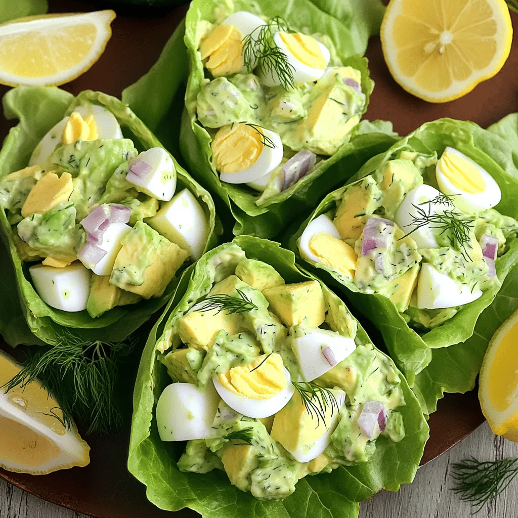 Now it’s time to make the wraps! Take a lettuce leaf and place it on a flat surface. Spoon a good amount of the avocado egg salad into the center of the leaf. Wrap the leaf around the filling like a taco. Press gently to hold it all together. Repeat this process with the other leaves and filling. Arrange the wraps on a platter and garnish with extra dill or parsley. Serve with lemon wedges for a fresh touch. Enjoy your healthy meal!