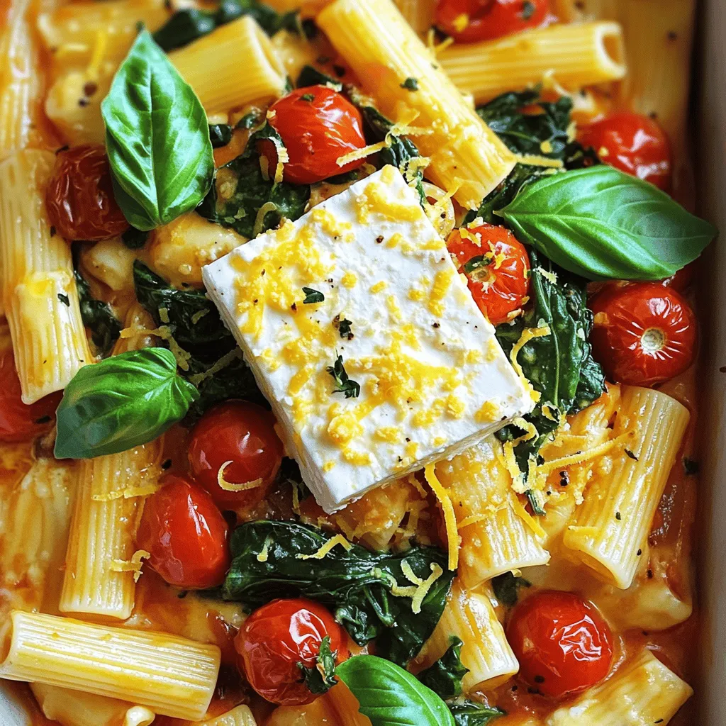 For serving, garnish your dish with fresh basil and a sprinkle of lemon zest. This adds a bright flavor that enhances the meal. Enjoy your delightful baked feta tomato pasta!