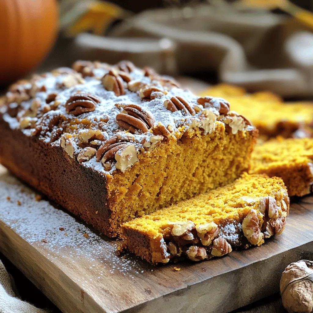 Serve your pumpkin pecan loaf warm for the best flavor. Slice it thick and place it on a rustic wooden board. Dust the top with powdered sugar for a lovely touch. Pair it with a cup of warm tea or coffee. You can also add whole pecans on the side for a nice look. If you like a little sweetness, spread butter or cream cheese on each slice.