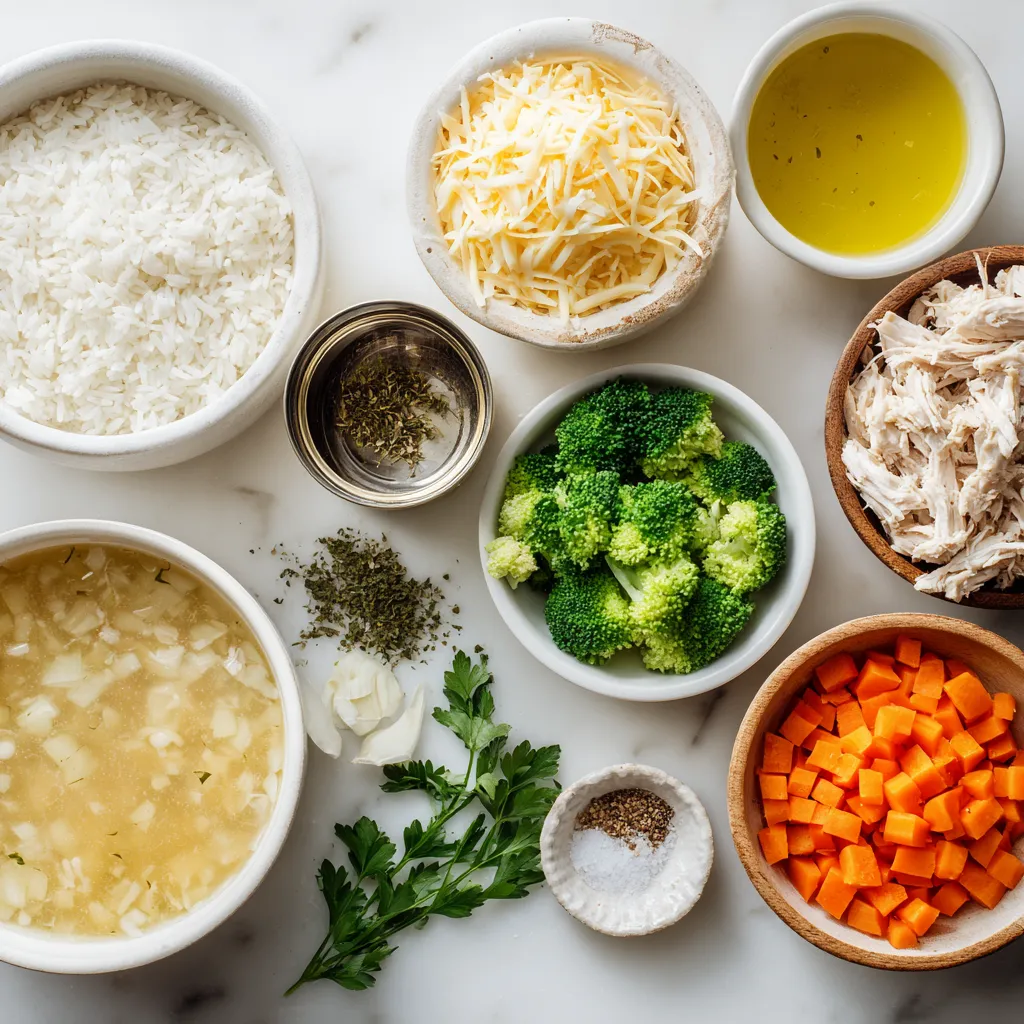 I love using these simple ingredients for my chicken and rice casserole. The rice serves as a great base, soaking up all the flavors. Cooked, shredded chicken adds protein and makes it filling. I often use rotisserie chicken for ease. Fresh vegetables like broccoli, carrots, and celery provide vitamins and texture.