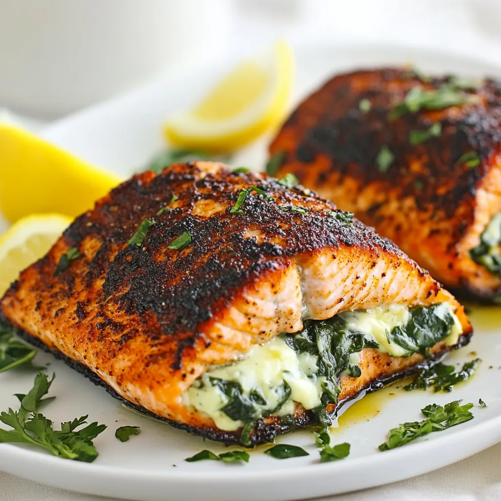 This simple method gives you a tasty blackened salmon stuffed with spinach. Enjoy serving it with lemon wedges for a bright finish!