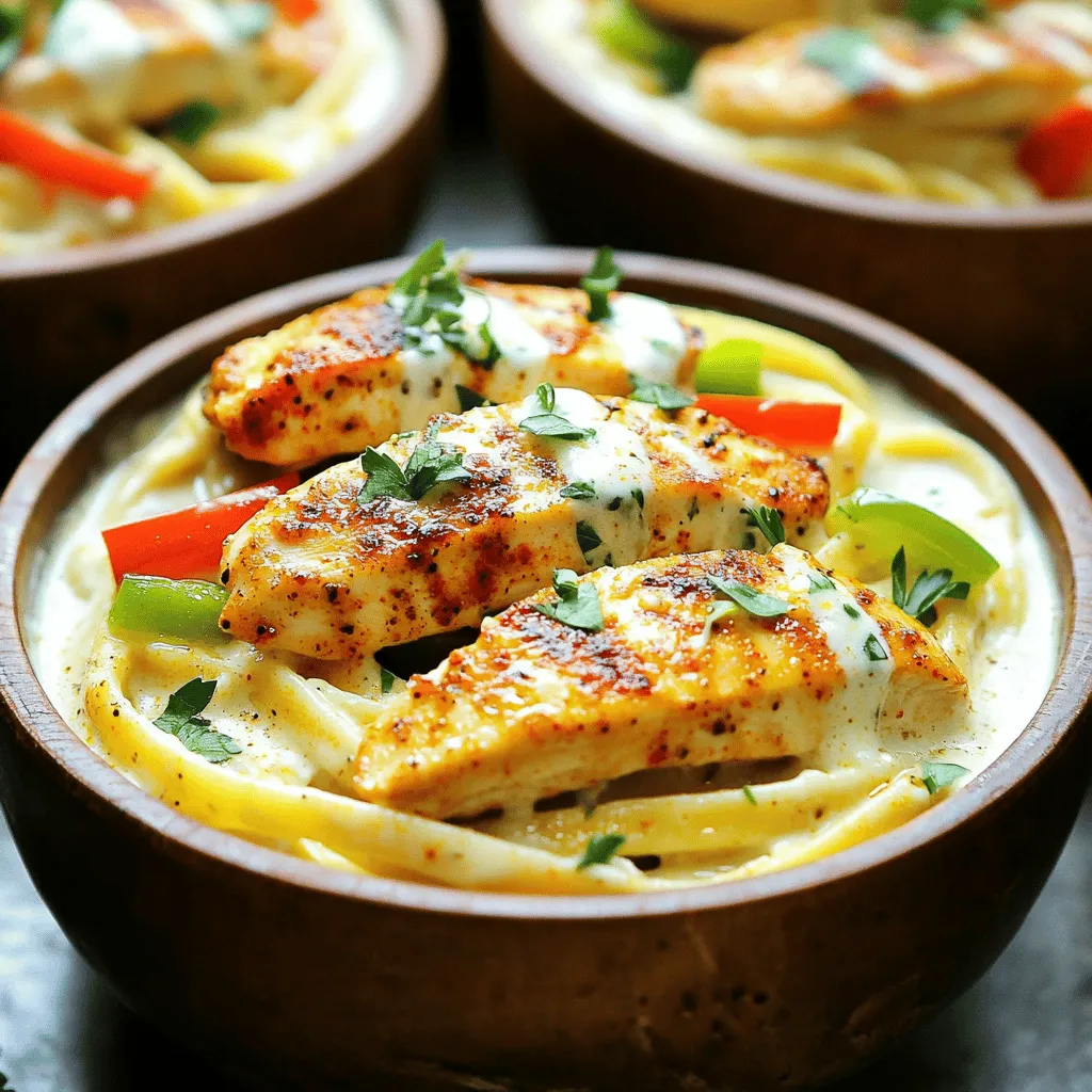 To make a zesty Cajun chicken pasta, you'll need a few key ingredients. Here’s the list: - 2 boneless, skinless chicken breasts - 2 tablespoons Cajun seasoning - 8 oz fettuccine pasta - 2 tablespoons olive oil - 1 red bell pepper, sliced - 1 green bell pepper, sliced - 1 small onion, sliced - 3 cloves garlic, minced - 1 cup heavy cream - 1 cup grated Parmesan cheese - Salt and pepper to taste - Fresh parsley, chopped (for garnish) These ingredients combine to create a dish full of flavor and comfort. The Cajun seasoning is key; it adds a nice kick and warmth to the chicken. I love using fresh bell peppers and onion, as they give a crisp texture and sweet taste. The heavy cream and Parmesan cheese make the sauce rich and creamy. Don't forget the parsley to brighten up your dish! - Bring salted water to a boil. - Cook fettuccine per package instructions. - Drain and set aside. Cooking pasta is simple. I always use salted water. It adds flavor. Boil your water until it bubbles. Add the fettuccine when it’s ready. Follow the package for cooking time. I like mine al dente. Once it’s cooked, drain it and let it rest. This will keep your pasta from getting sticky. - Season chicken with Cajun seasoning. - Cook in skillet until golden brown. - Let rest and slice into strips. Next, we focus on the chicken. I season both sides of the chicken breasts with Cajun seasoning. This gives it a nice kick. Heat olive oil in a skillet. Add the chicken and cook for about 5 to 7 minutes on each side. You want it golden brown and fully cooked. Once done, let the chicken rest for a few minutes. This makes it juicy. Then slice it into strips. - Sauté peppers, onion, and garlic in skillet. - Add heavy cream and simmer. - Stir in Parmesan cheese and season. Now, let’s make the sauce. In the same skillet, add sliced red and green peppers, along with onion and garlic. Sauté these for about 5 minutes. You want them tender. Then pour in the heavy cream. Let it simmer a bit. This thickens the sauce. Stir in grated Parmesan cheese. It makes the sauce creamy and rich. Don’t forget to season with salt and pepper to taste. - Toss cooked pasta and chicken in the sauce. - Heat through before serving. Finally, it’s time to combine everything. Add the cooked fettuccine and sliced chicken to the skillet. Toss it all together to coat the pasta and chicken with that creamy sauce. Cook for an additional two minutes on low heat. This warms everything up nicely. Now you’re ready to serve your delicious Cajun chicken pasta! - Always boil salted water before cooking pasta. This adds flavor. - Cook the fettuccine until al dente. This means it should be firm, not mushy. - Drain the pasta right when it’s done. Overcooking ruins the texture. - You can make your own Cajun seasoning. Mix paprika, cayenne, garlic powder, and oregano. - If you like it mild, use less seasoning. Add more if you enjoy heat. - Taste as you go! This helps you find the right spice level for you. - Serve the pasta in bowls for a homey feel. - Add a sprinkle of fresh parsley on top. It adds color and freshness. - Drizzle some olive oil over the dish. It gives a nice shine and taste. - Use plates for a fancier look. Choose flat plates to show off the meal. {{image_2}} You can switch up the protein in Cajun chicken pasta easily. If you want a different taste, try shrimp or sausage. Shrimp cooks fast and adds a nice flavor. Just sauté it in the skillet until it turns pink. Sausage will give a hearty touch. Slice it and cook until brown. For a veggie option, use chickpeas or tofu. Both give good protein without meat. Season them just like the chicken. Cook until golden and add them to the pasta. This way, everyone can enjoy a tasty meal. Adding vegetables can make this dish even better. Try spinach or mushrooms for extra flavor. Spinach wilts down nicely in the sauce. It adds color and health benefits. Mushrooms bring an earthy taste that pairs well with the cream. Think about using seasonal veggies too. In spring, add asparagus or peas. In fall, try roasted squash or zucchini. This keeps your dish fresh and full of flavors. You can make the sauce lighter if you prefer. Use low-fat cream instead of heavy cream. This keeps the creaminess but cuts some calories. If you're dairy-free, try coconut milk or cashew cream. Both give a rich taste without dairy. Just swap them in the recipe and enjoy a new twist. To keep Cajun chicken pasta fresh, I recommend putting leftovers in the fridge. Use an airtight container to seal in the flavor. This helps prevent the sauce from drying out. Make sure to eat the leftovers within three to four days for the best taste. When it's time to heat up your pasta, use the stove for the best results. Add a splash of cream or broth to keep it creamy. Heat it on low, stirring gently. You want to avoid burning the sauce. Microwave works too, just cover it with a lid. Heat in short bursts, stirring in between. To freeze leftovers, let the pasta cool completely first. Then, place it in a freezer-safe container. Make sure to leave some space at the top, as it may expand. This dish can last in the freezer for about two to three months. When ready to eat, thaw it in the fridge overnight before reheating. Cajun chicken pasta is a dish full of flavor. It combines chicken, pasta, and veggies in a creamy sauce. The key ingredients are chicken breasts, fettuccine pasta, bell peppers, and Cajun seasoning. Cajun seasoning brings a zesty kick, making this dish pop. It is easy to make and brings a taste of Louisiana to your table. Yes, you can make Cajun chicken pasta ahead of time. First, cook the pasta and chicken, then store them separately. This helps keep the pasta from getting mushy. When ready to eat, just reheat them together in a pan. Add a bit of cream or water to keep it creamy. You can also chop veggies ahead to save time. You can serve Cajun chicken pasta with several tasty sides. A fresh green salad pairs well and adds crunch. Garlic