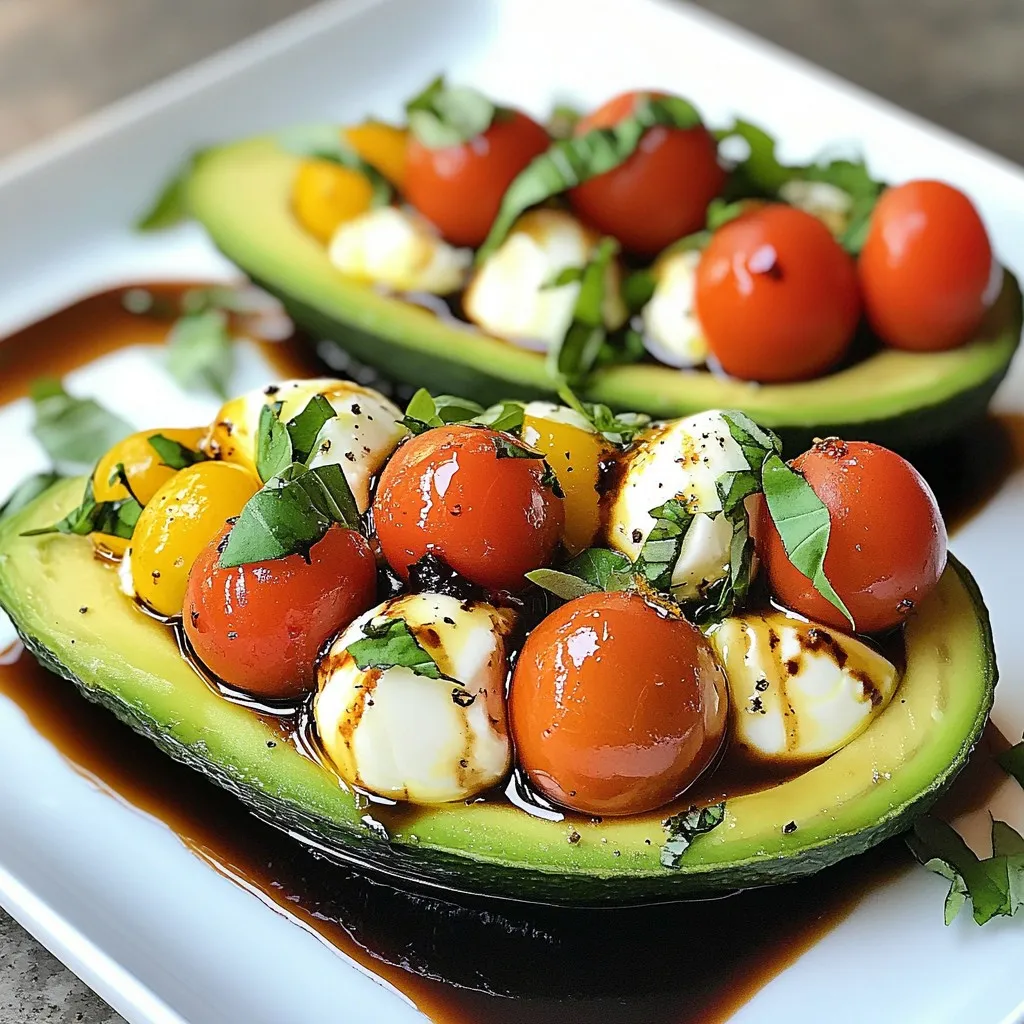 - 2 ripe avocados - 1 cup cherry tomatoes, halved - 1 cup fresh mozzarella balls (bocconcini), halved - 1/4 cup fresh basil leaves, chopped - 2 tablespoons balsamic glaze - 1 tablespoon extra virgin olive oil - Salt and pepper to taste You can add some extras to make this dish even better. Try these: - Sliced red onion for crunch - Pine nuts for a nutty flavor - Grilled chicken for protein - A dash of crushed red pepper for heat You will need a few simple tools to make this dish: - A sharp knife for slicing - A mixing bowl for the filling - A spoon for scooping out the avocado - A small bowl for mixing the glaze - A serving plate for a beautiful presentation {{ingredient_image_1}} Start by slicing the avocados in half lengthwise. Then, remove the pits carefully. Use a spoon to scoop out a small amount of the avocado flesh. This creates extra space for your filling. You want to keep the skin intact, so scoop gently. Set your avocado halves aside on a plate. In a medium bowl, combine the halved cherry tomatoes and mozzarella balls. Add the chopped basil to the bowl. Next, drizzle in the extra virgin olive oil and balsamic glaze. Season with salt and pepper to your taste. Mix everything gently until well combined. This bright mixture is key to a fresh taste. Take the Caprese filling and carefully spoon it into the avocado halves. Fill each half generously. If you want an extra touch, drizzle more balsamic glaze on top. This adds a beautiful shine and flavor. Serve your stuffed avocados on a colorful plate or a wooden board. A few extra basil leaves make a lovely garnish. Enjoy your fresh and tasty dish! Choose ripe avocados for the best flavor. Look for avocados that yield slightly to gentle pressure. If they feel hard, they need more time to ripen. If they feel too soft, they may be overripe. The skin should be dark green or almost black. Avoid any with large dark spots or blemishes. A little seasoning goes a long way. Use salt and pepper to bring out the natural flavors. You can add garlic powder or crushed red pepper for a kick. Fresh lemon juice brightens the flavors as well. Always taste your Caprese filling before stuffing the avocados. Adjust seasonings based on your preference. Presentation matters. Serve the stuffed avocados on a wooden board or a colorful plate. Garnish with extra basil leaves for a fresh touch. Drizzle additional balsamic glaze over the top for an eye-catching finish. This simple step makes your dish look gourmet. Your guests will be impressed! Pro Tips Choose Ripe Avocados: Make sure to select avocados that are slightly soft to the touch, indicating they are ripe and ready to be enjoyed. Fresh Ingredients Matter: Using fresh mozzarella and basil will enhance the flavors, making your stuffed avocados even more delicious. Customize Your Fillings: Feel free to add other ingredients like diced red onion or olives to the Caprese mixture for a unique twist. Serve Immediately: For the best taste and presentation, serve the stuffed avocados right after preparing them to prevent browning. {{image_2}} You can change the cheese to fit your taste. Try feta cheese for a salty kick. Goat cheese adds a tangy flavor. A sharp cheddar gives a nice twist. Just remember to keep the cheese in small pieces. It should blend well with the other ingredients. Adding protein makes this dish heartier. Grilled chicken works great for a filling option. Just chop it into small pieces and mix it in. Shrimp is another tasty choice. Cook the shrimp until pink and tender, then dice it. Both options pair well with the fresh flavors of tomatoes and basil. You can make this dish vegan easily. Replace mozzarella with vegan cheese. Many brands offer great dairy-free options. You can also skip the cheese and add more tomatoes or veggies. Try adding chickpeas for protein. This keeps the dish rich and satisfying while staying plant-based. To store leftover Caprese stuffed avocados, place them in an airtight container. This helps keep them fresh. If you can, cover the avocados with plastic wrap. This adds another layer of protection. Make sure to keep them in the fridge. Reheating stuffed avocados is tricky. I recommend eating them cold. The flavors blend well when they chill. If you must reheat, try a low setting in the oven. Heat just until warm, but avoid cooking them too long. You want to keep the avocado creamy. For best taste, eat the stuffed avocados within two days. After this, the avocado may brown and lose flavor. Always check for freshness before eating. If they look or smell off, it's best to discard them. Enjoy your tasty dish while it's at its best! Yes, you can prep some parts ahead. You can chop the tomatoes and basil. Mix them with olive oil and balsamic glaze. Store this mixture in the fridge for up to two hours. However, wait to stuff the avocados until just before serving. This keeps the avocados fresh and green. If you don't have mozzarella, try feta or goat cheese. These cheeses add a tangy flavor. You can also use vegan cheese for a dairy-free option. Just make sure it melts well if you want a creamy texture. Yes, Caprese Stuffed Avocados are very healthy! Avocados are full of good fats. They help your heart and keep you full. Tomatoes add vitamins, and basil gives you antioxidants. This dish is a great mix of nutrients. Plus, it is low in carbs and high in healthy ingredients. In this blog post, we explored how to make Caprese Stuffed Avocados. We listed ingredients and useful optional add-ins. I explained the steps for preparing the avocados, making the filling, and assembling the dish. We discussed tips for selecting great avocados and enhancing taste. You learned about variations with cheese and protein options. Finally, I provided storage tips to keep your dish fresh. Enjoy making and sharing this healthy, tasty treat!