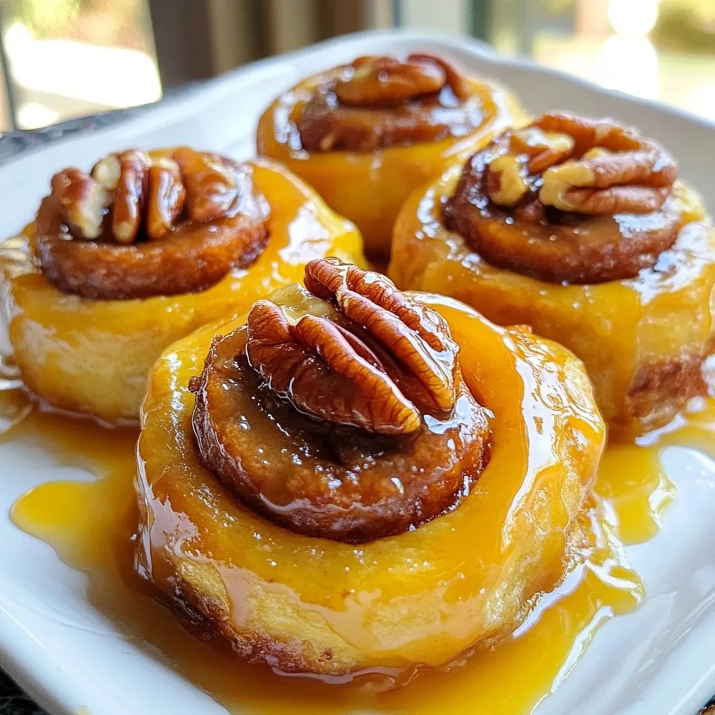 Delicious sticky buns topped with caramel and pecans, perfect for breakfast or dessert.