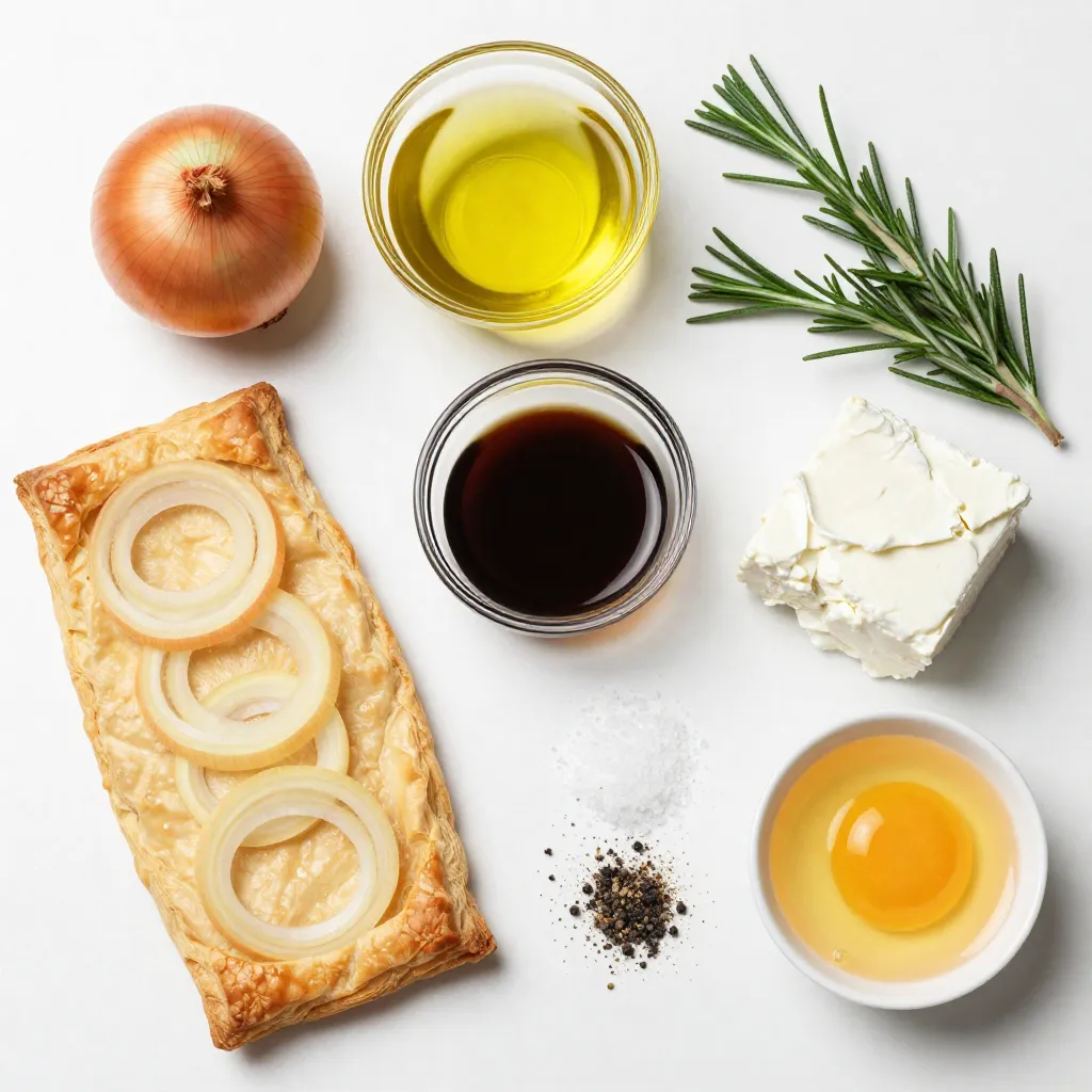 To make this tart, you need a few key ingredients. First, you will use one sheet of puff pastry. This will be the base of your tart. Next, you need two large onions. Thinly slice them for the best flavor. You will also need two tablespoons of olive oil for cooking the onions.