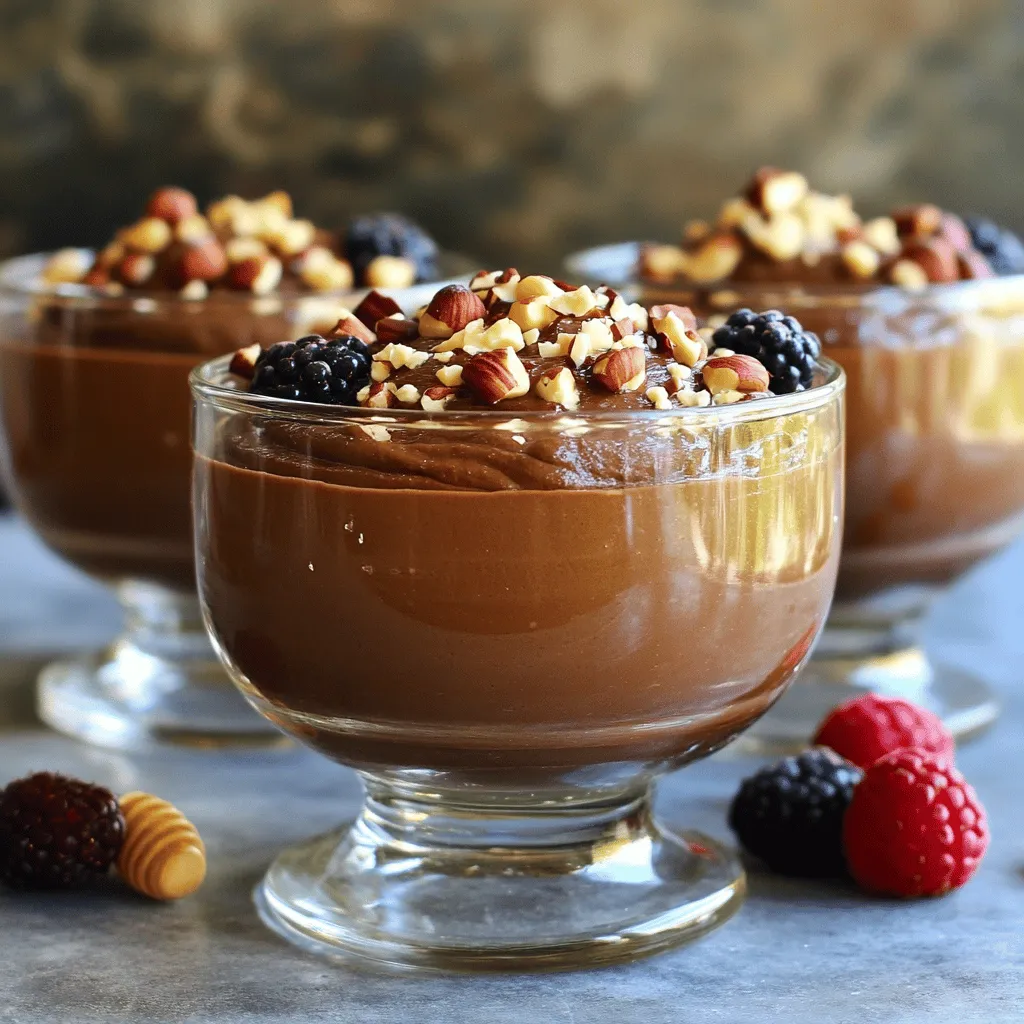 When ready to serve, spoon the mousse into clear cups or bowls. This shows off the creamy texture. Top with chopped hazelnuts and fresh berries for a beautiful finish.