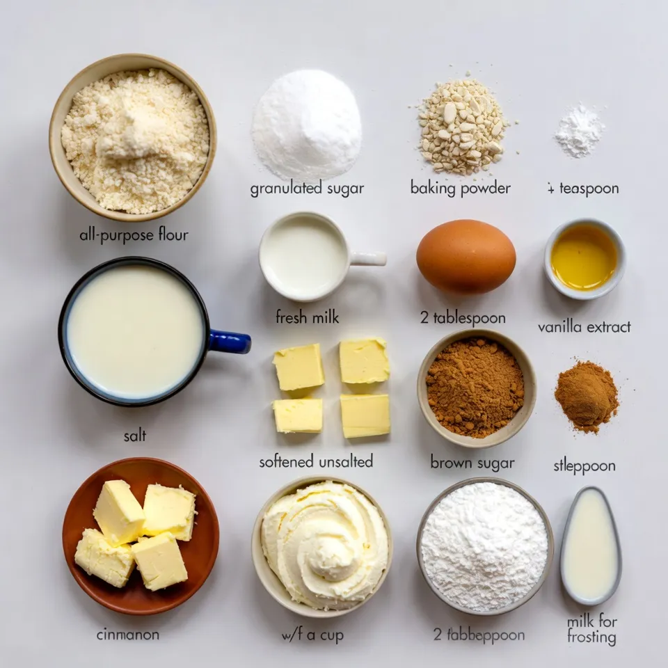 To make cinnamon roll pancakes, start with simple and fresh ingredients. All-purpose flour gives the pancakes a nice base. Sugar and brown sugar add sweetness, while baking powder helps with fluffiness. Salt brings out all the flavors. You need milk and an egg for moisture and richness. Melted butter and vanilla extract give them a lovely taste. The cinnamon and brown sugar mixture creates that classic cinnamon roll swirl. For the cream cheese frosting, cream cheese and powdered sugar provide that sweet finish.