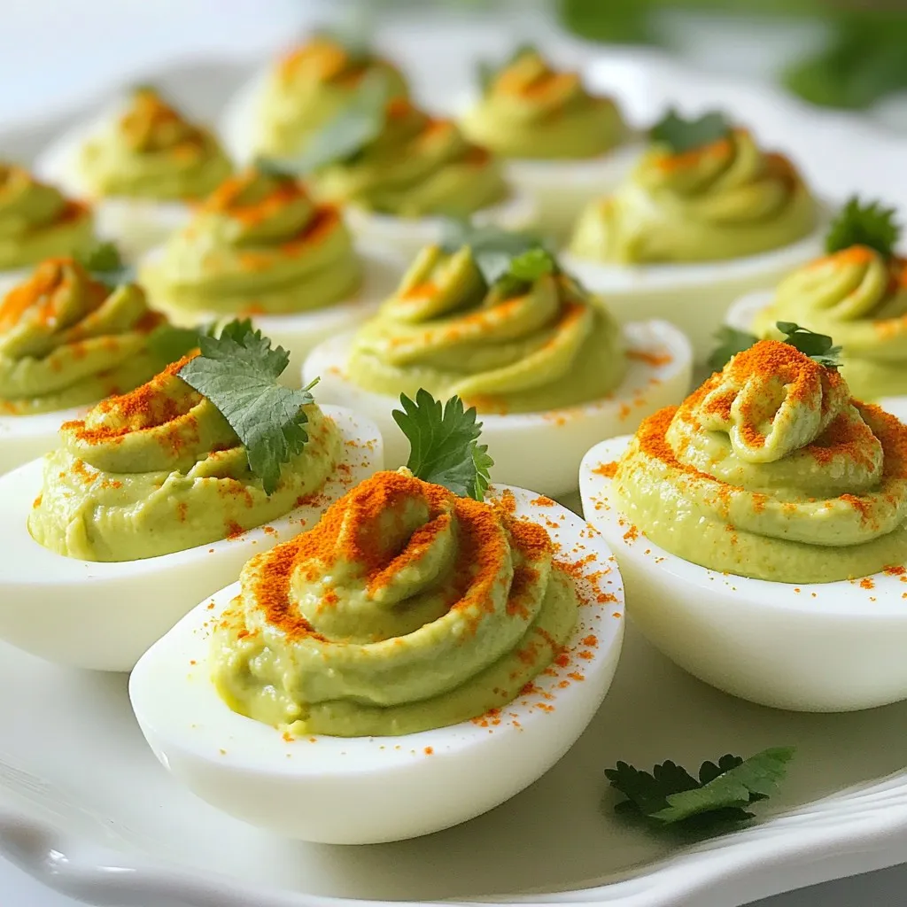 Now it’s time to fill the egg whites. You can use a spoon or a piping bag for this. Make sure to fill each egg half with the avocado mix. Try to be generous! Once filled, sprinkle paprika on top for color. Add a few fresh cilantro leaves for garnish. This gives a nice touch to your deviled eggs. Serve them chilled or at room temperature. Enjoy the flavor!