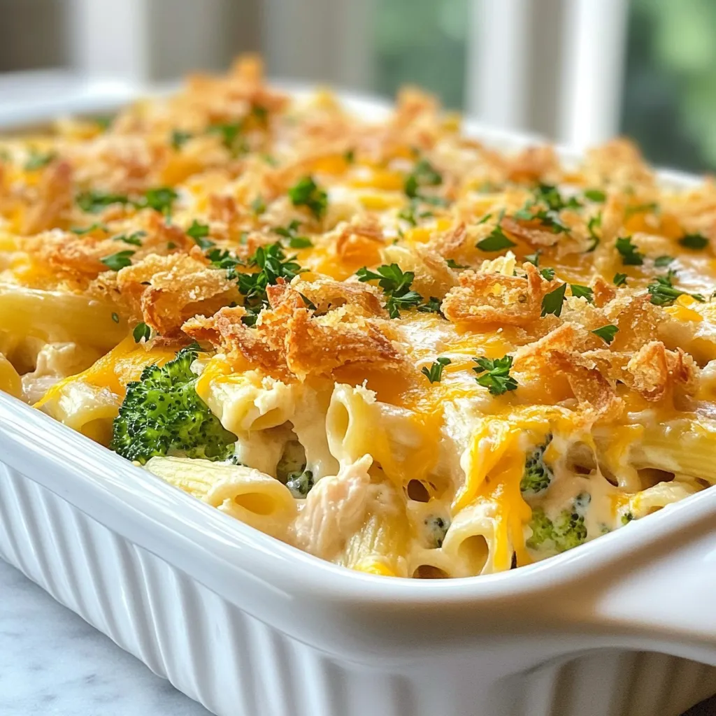 A creamy and cheesy baked pasta dish with shredded chicken and broccoli.