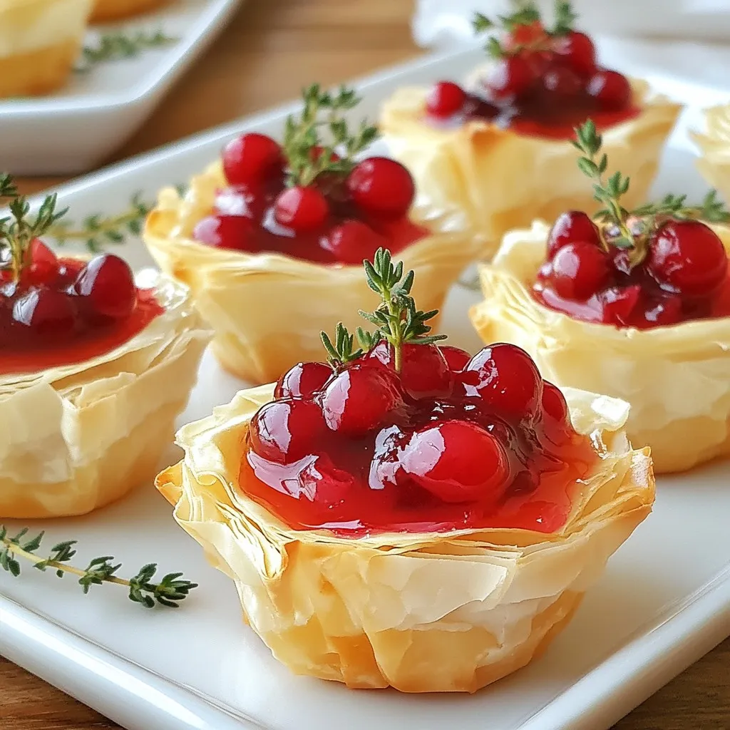 Delicious phyllo cups filled with creamy brie, sweet cranberry sauce, and fresh thyme.