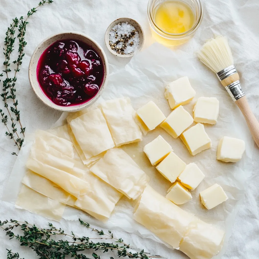 Each ingredient plays a key role. The phyllo dough gives a crispy base. The brie melts perfectly, adding creamy richness. The cranberry sauce brings sweet and tart flavors. Fresh thyme adds a hint of earthiness. Honey balances the flavors with sweetness. Salt and pepper enhance the taste. Finally, cooking spray or butter helps the dough crisp up nicely.