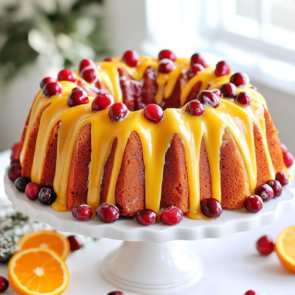 To make this tasty cake, gather these main ingredients: - 2 cups all-purpose flour - 1 ½ cups fresh cranberries, roughly chopped - 1 cup granulated sugar - ½ cup unsalted butter, softened - ½ cup Greek yogurt - 3 large eggs - 1 tablespoon orange zest - ½ cup freshly squeezed orange juice - 1 teaspoon baking powder - ½ teaspoon baking soda - ½ teaspoon salt - 1 teaspoon vanilla extract These ingredients create a perfect blend. The fresh cranberries add tartness. The orange zest and juice bring bright flavors. For a sweet glaze, you will need: - 1 cup powdered sugar - 2 tablespoons orange juice - 1 teaspoon orange zest This glaze adds a nice, glossy finish. The orange juice makes it tangy and sweet. To make your cake look special, consider these garnishes: - Whole cranberries - Slices of fresh orange These garnishes enhance the cake's look. They also add a fresh touch to each slice. {{ingredient_image_1}} Start by gathering your ingredients. You need: - 2 cups all-purpose flour - 1 ½ cups fresh cranberries, roughly chopped - 1 cup granulated sugar - ½ cup unsalted butter, softened - ½ cup Greek yogurt - 3 large eggs - 1 tablespoon orange zest - ½ cup freshly squeezed orange juice - 1 teaspoon baking powder - ½ teaspoon baking soda - ½ teaspoon salt - 1 teaspoon vanilla extract Next, preheat your oven to 350°F (175°C). Grease your bundt pan well with butter or non-stick spray. This helps the cake slide out easily later. In a large bowl, cream the softened butter and sugar together until it looks light and fluffy. This should take about two minutes. Add the eggs one at a time. Make sure to mix well after each addition. Then, stir in the Greek yogurt, orange zest, and vanilla extract. Mix until everything is smooth and combined. In a separate bowl, whisk together the flour, baking powder, baking soda, and salt. Gradually add this dry mix to the wet mix. Alternate with the orange juice, starting and ending with the flour mix. Stir just until you see no dry flour. Finally, fold in the chopped cranberries. Be gentle; you want to keep the cranberries intact. Pour the batter into your greased bundt pan. Smooth the top using a spatula. Then, place it in the oven. Bake for 50 to 60 minutes. To check if it’s done, insert a toothpick into the center. If it comes out clean, your cake is ready. Once baked, take the cake out of the oven. Let it cool in the pan for 10 to 15 minutes. This step is key; it helps the cake set. After that, flip it onto a wire rack to cool completely. To make the glaze, you will need: - 1 cup powdered sugar - 2 tablespoons orange juice - 1 teaspoon orange zest In a bowl, mix the powdered sugar, orange juice, and orange zest. Whisk until it’s smooth. Once your cake is cool, drizzle the glaze over the top. Let it drip down the sides for a lovely finish. Enjoy your beautiful cranberry orange bundt cake! To keep your cranberry orange bundt cake moist, use fresh cranberries. They add juice and flavor. Greek yogurt is also key. It gives the cake a rich texture. Make sure not to overmix the batter. Mix just until the dry ingredients blend in. This helps keep the cake tender. Greasing the bundt pan well is vital. Use softened butter or non-stick spray. Cover every corner and crevice. A light dusting of flour can help too. After greasing, tap the pan upside down to remove excess flour. This way, the cake releases easily after baking. For a lovely presentation, place the cake on a cake stand. Drizzle the orange glaze over the top. Add whole cranberries and orange slices around the base. This adds color and charm. Pair each slice with a dollop of whipped cream or a scoop of vanilla ice cream. It makes the cake even more delicious and fun! Pro Tips Use Fresh Cranberries: Fresh cranberries provide a tart flavor that complements the sweetness of the cake. If using frozen, ensure they are thawed and drained well to avoid excess moisture. Room Temperature Ingredients: Make sure your eggs and butter are at room temperature for better emulsification, resulting in a lighter and fluffier cake. Don't Overmix: When combining the wet and dry ingredients, mix just until combined. Overmixing can lead to a dense cake texture. Glaze Variations: Feel free to experiment with the glaze by adding a splash of vanilla or almond extract for a unique flavor twist that pairs well with the cranberries and orange. {{image_2}} You can easily swap some ingredients in this cake. If you don’t have Greek yogurt, use sour cream instead. It keeps the cake moist and adds a tangy flavor. For a gluten-free option, replace all-purpose flour with a gluten-free blend. Just make sure it has a good binding agent. You can also use coconut sugar or honey if you want a different sweetness. Each choice will give your cake a unique twist. Change flavors with the seasons. In spring, add lemon zest for a fresh taste. In summer, use berries like blueberries or raspberries along with cranberries. Fall is perfect for adding spices like cinnamon or nutmeg. For winter, consider adding chopped nuts for extra crunch and warmth. Each season brings a new chance to enjoy this cake in a different way. Boost the flavor with some easy enhancements. Add a splash of almond extract for a nutty touch. You can also mix in some chopped walnuts or pecans for added texture. For a citrus twist, try adding a bit of lime zest along with the orange. If you love chocolate, fold in some mini chocolate chips. These small changes can make your Cranberry Orange Bundt Cake truly special. To keep your cake fresh, wrap it tightly in plastic wrap. You can also place it in an airtight container. Store it at room temperature for up to three days. If you want to keep it longer, consider freezing it. To freeze the cake, first let it cool completely. Then, wrap it well in plastic wrap and foil. This method keeps the cake moist. You can freeze it for up to three months. When you're ready to enjoy it, simply thaw it in the fridge overnight. If you want to w