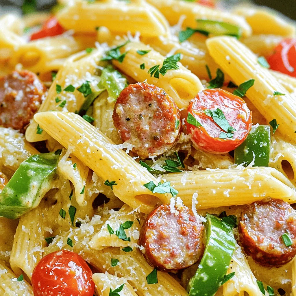 Now it’s time to bring everything together. Add the cooked sausage back into the skillet, along with 1 cup of halved cherry tomatoes. Stir until everything is coated with the creamy sauce. Let it bubble for another 2 minutes. Finally, add the cooked penne pasta to the skillet. Toss gently to mix everything well. Make sure the pasta is fully coated with the sauce. Season with salt and pepper to taste.
