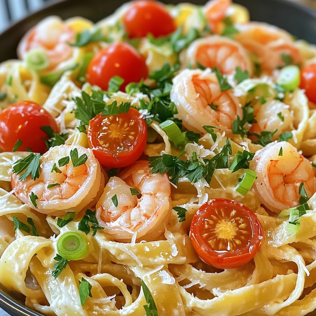 Now comes the fun part! Stir in 1/2 cup of grated Parmesan cheese and 1/2 cup of halved cherry tomatoes. Cook for an extra 2 to 3 minutes until the tomatoes soften. If your sauce seems too thick, add some of that reserved pasta water slowly until it reaches your desired consistency. Return the cooked shrimp to the skillet and add the drained fettuccine. Toss everything together so the pasta is coated in the creamy sauce. Season with salt and pepper to taste.