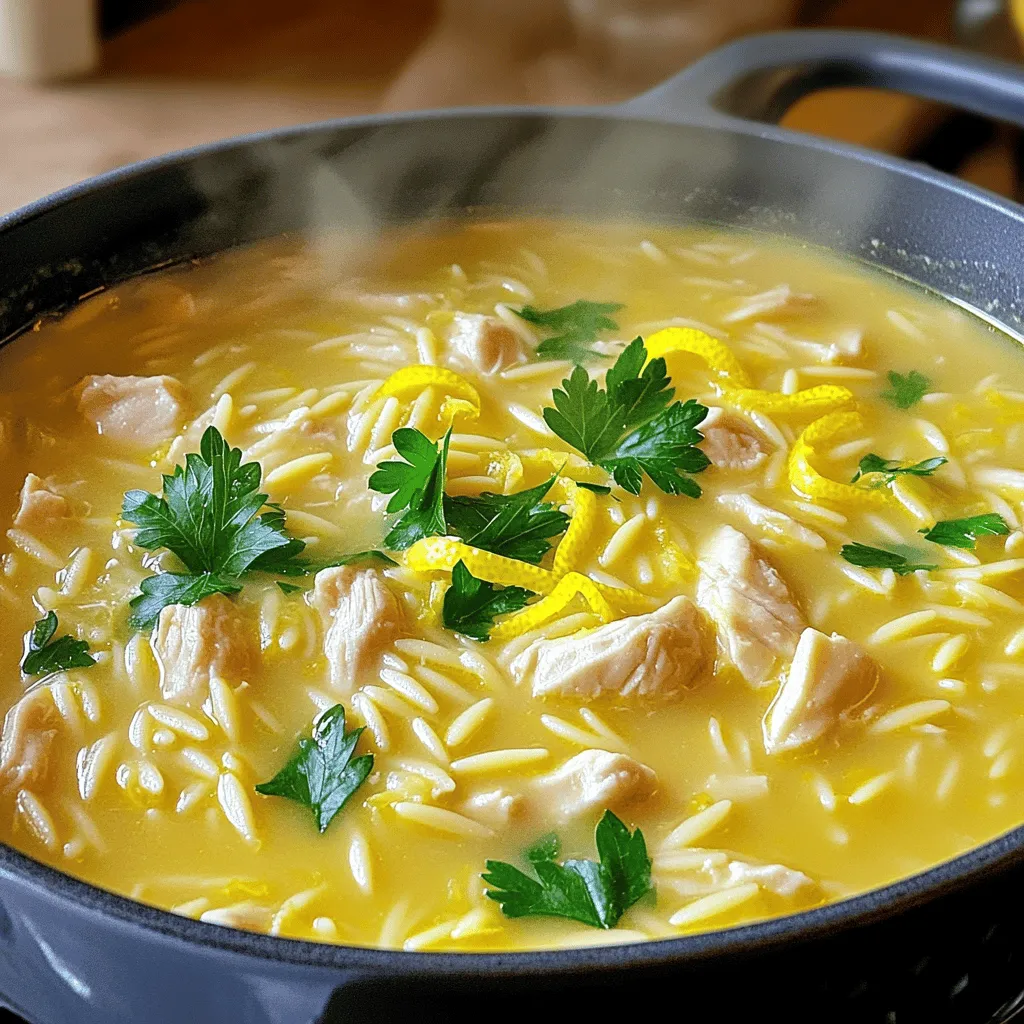 To make Creamy Lemon Chicken Orzo Soup, you need the following: - 2 tablespoons olive oil - 1 small onion, diced - 2 cloves garlic, minced - 2 medium carrots, sliced - 2 celery stalks, diced - 1 pound chicken breast, diced - 6 cups chicken broth - 1 cup orzo pasta - 1 cup heavy cream - Zest and juice of 1 large lemon - 1 teaspoon dried thyme - Salt and pepper to taste - Fresh parsley, chopped (for garnish) These ingredients create a rich and creamy base. The chicken adds protein, while the orzo gives it heartiness. You can enhance the soup with these optional ingredients: - A pinch of red pepper flakes for heat - Fresh lemon slices for garnish - Spinach or kale for extra greens These options can change the flavor profile. Feel free to mix and match based on what you enjoy. To prepare this soup, gather these cooking tools: - A large pot or Dutch oven for cooking - A cutting board and knife for chopping - A wooden spoon for stirring - Measuring cups and spoons for accuracy - Bowls for serving Having the right tools makes cooking easier. It helps you focus on what matters: creating a delicious meal. First, gather all your ingredients. You will need olive oil, onion, garlic, carrots, celery, chicken, chicken broth, orzo pasta, heavy cream, lemon, thyme, salt, pepper, and parsley. Dice the onion and chicken, mince the garlic, slice the carrots, and dice the celery. This setup makes cooking smooth and easy. In a large pot, heat 2 tablespoons of olive oil over medium heat. Add the diced onion and sauté it for 3-4 minutes. You want the onion to be soft and translucent. Next, stir in the minced garlic, sliced carrots, and diced celery. Cook these for about 5 minutes. Stir them occasionally until the vegetables soften. This step builds a great flavor base for the soup. Now, add the diced chicken breast to the pot. Cook it for 5-7 minutes, stirring often. You want the chicken to brown on all sides. Once browned, pour in 6 cups of chicken broth and bring this to a boil. When boiling, add 1 cup of orzo pasta, 1 teaspoon of dried thyme, and season with salt and pepper. Lower the heat to medium-low and let it simmer for about 10 minutes. You will know it’s done when the orzo is al dente. Then, stir in 1 cup of heavy cream, lemon zest, and lemon juice. Allow the soup to warm for 2-3 minutes before serving. Garnish with fresh parsley for a nice touch. To get the creamiest soup, use heavy cream. This thickens the soup and adds richness. Stir in the cream at the end of cooking. This keeps it fresh and smooth. You can also add a bit of lemon zest for extra flavor. Cook orzo separately to avoid mushiness. Add it to the soup when it is nearly done. This way, it stays firm. Cook it just until al dente, which means it is still slightly firm to bite. This ensures a nice texture in every spoonful. Taste your soup as you go. Start with salt and pepper, then adjust to your liking. Add more lemon juice for a brighter taste. If you want a herbal note, fresh thyme works great. Fresh parsley on top adds color and a fresh taste, too. {{image_2}} You can change the soup based on what you have. Swap chicken for shrimp or tofu. For veggies, add spinach, peas, or bell peppers. Each choice brings a new taste. If you like, try using sweet potatoes for a hint of sweetness. You can even add green beans for more crunch. This soup is flexible to fit your mood. If you need a gluten-free meal, use gluten-free orzo or rice. Both work well in this soup. For a dairy-free version, swap heavy cream with coconut milk. It adds a lovely flavor and keeps it creamy. You can also use almond milk for a lighter option. Just make sure it’s unsweetened to keep the soup savory. Want to spice things up? Add red pepper flakes or a dash of hot sauce. You can also mix in diced jalapeños for a fresh bite. If you love flavor, consider adding a pinch of smoked paprika. It gives a warm taste and pairs well with the lemon. Just be careful; a little spice goes a long way! To keep your creamy lemon chicken orzo soup fresh, store it in an airtight container. Make sure to let the soup cool down before sealing it. This helps prevent condensation, which can make the soup watery. You can keep it in the fridge for up to three days. If you want to enjoy it later, freezing is a great option. When it’s time to reheat, do it gently. Pour the soup into a pot over low heat. Stir often to avoid sticking. If the soup seems thick, add a splash of chicken broth to thin it out. Heat until warm, but don’t let it boil. This keeps the creamy texture smooth and tasty. To freeze the soup, use freezer-safe containers. Leave some space at the top for expansion. It’s best to freeze the soup without the cream added. When you’re ready to eat, thaw it overnight in the fridge. Then, reheat it on the stove and stir in the heavy cream. This way, your soup stays creamy and delicious! You can serve this soup with crusty bread. A warm baguette works great. You may also enjoy it with a fresh side salad. A simple mix of greens and lemon vinaigrette pairs well. Add some cheese on top for extra flavor. A sprinkle of Parmesan can make it even better. Yes, you can make this soup in a slow cooker. Start by sautéing the onion, garlic, carrots, and celery in a pan. This step adds great flavor. Then, transfer the veggies to your slow cooker. Add the chicken, broth, and thyme. Cook on low for 6-8 hours. Add the orzo during the last 30 minutes. Stir in the cream and lemon before serving. This soup can last about 3 to 4 days in the fridge. Store it in an airtight container to keep it fresh. If you notice any change in smell or color, toss it out. Reheat it on the stove or in the microwave. Adding a splash of broth can help restore its creaminess. This blog post covered making a creamy lemon chicken orzo soup. We discussed essential and optional ingredients, cooking tools, and step-by-step instructions. I shared tips for a creamy texture and flavor tweaks. We explored variations for dietary