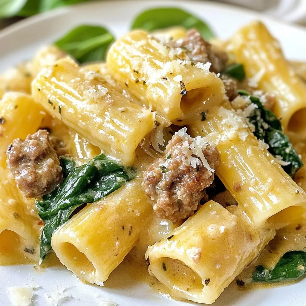 A rich and creamy pasta dish featuring Italian sausage and spinach.