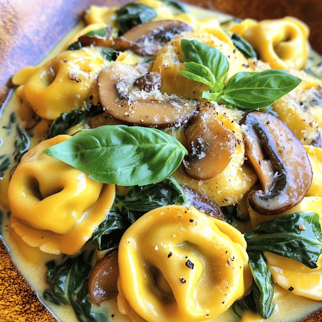 - 12 ounces cheese tortellini - 2 tablespoons olive oil - 1 medium onion, finely chopped - 3 cloves garlic, minced - 8 ounces mushrooms, sliced (cremini or button) - 5 cups fresh spinach, roughly chopped - 1 cup heavy cream - 1/2 cup grated Parmesan cheese - Salt and pepper to taste - 1/4 teaspoon nutmeg - Fresh basil, for garnish (optional) The right ingredients make all the difference in this creamy dish. First, you need cheese tortellini. It gives a rich flavor and nice texture. Next, we use olive oil. This helps sauté the veggies and adds healthy fat. Onions and garlic bring a savory base to the sauce. Mushrooms add earthiness. I prefer cremini mushrooms for their deeper taste, but button mushrooms work well too. Fresh spinach is key for color and nutrition. It wilts down and blends beautifully with the cream. Heavy cream creates that dreamy, silky sauce. Parmesan cheese adds umami depth and a bit of saltiness. Don't forget salt and pepper. They enhance all the flavors. Nutmeg gives a warm touch that makes the sauce special. Finally, fresh basil can brighten the dish if you choose to use it. With these ingredients, you set yourself up for a delightful cooking experience. To cook the tortellini to al dente, fill a large pot with water. Add a good amount of salt, then bring it to a boil. Once boiling, add 12 ounces of cheese tortellini. Cook according to the package instructions. Usually, this takes about 3 to 5 minutes. Stir gently to prevent sticking. The tortellini is ready when it is firm but tender. Drain the pasta and set it aside. In a large skillet, heat 2 tablespoons of olive oil over medium heat. Add 1 medium onion, finely chopped, and cook for about 3 to 4 minutes. The onion should turn translucent. Next, add 3 cloves of minced garlic and 8 ounces of sliced mushrooms. Stir and cook until the mushrooms soften and turn golden, about 5 to 7 minutes. Finally, toss in 5 cups of roughly chopped spinach. Cook until the spinach wilts, which takes about 2 to 3 minutes. Pour in 1 cup of heavy cream and bring it to a gentle simmer. Stir in 1/2 cup of grated Parmesan cheese, along with salt, pepper, and 1/4 teaspoon of nutmeg. Mix well until the cheese melts and the sauce becomes creamy. Add the cooked tortellini to the skillet and gently toss everything together. Cook for another 2 to 3 minutes until everything is heated through. Taste the dish and adjust the seasoning if needed. Serve warm, and feel free to garnish with fresh basil if you like. You can find many types of tortellini. Cheese tortellini is the most common. It has a rich flavor that pairs well with creamy sauces. You might also try spinach or mushroom-filled tortellini. These add more depth to your dish. If you want to be bold, try a meat-filled option. Each type brings its own taste. Choose what excites you the most! To make your dish pop, focus on seasoning. Start with salt and pepper. Taste as you go, and adjust as needed. Adding nutmeg gives a warm touch. It blends well with the cream and cheese. If you want more punch, try a splash of lemon juice. A hint of acidity balances the creaminess. Fresh herbs like basil or parsley can also brighten the dish. If you want a vegetarian version, swap out the cheese tortellini for a veggie option. Many brands offer spinach or mushroom tortellini without cheese. For a vegan dish, use coconut cream instead of heavy cream. Nutritional yeast can replace Parmesan cheese. It adds a cheesy flavor without dairy. You can also add more veggies like bell peppers or zucchini for texture and taste. {{image_2}} You can easily boost the nutrition of your creamy spinach mushroom tortellini by adding protein. Here are some tasty options: - Chicken: Grill or sauté some diced chicken breast. Add it to the creamy sauce for extra flavor and protein. - Shrimp: Sauté shrimp in olive oil until they turn pink. Toss them in with the tortellini for a seafood twist. - Tofu: For a vegetarian option, use firm tofu. Cube and sauté until golden. Mix it into the dish for a hearty bite. Each protein adds its unique taste, making the dish versatile. If you want to switch things up, try different veggies in your tortellini: - Kale: This adds a hearty texture. Use it instead of spinach for a nutrient boost. - Broccoli: Steamed broccoli florets can add crunch and color to your dish. - Zucchini: Sautéed zucchini provides a fresh taste and pairs well with the creamy sauce. Experimenting with veggies keeps the dish exciting and flavorful. For those avoiding gluten, there are great alternatives for tortellini: - Rice-Based Tortellini: Many brands offer gluten-free options made from rice flour. They cook similarly to regular tortellini. - Zucchini Noodles: Use a spiralizer to create zucchini noodles. They add a unique flavor and are low in carbs. - Chickpea Pasta: This type of pasta is high in protein and fiber. It works well in creamy dishes. These choices maintain the dish's integrity while catering to gluten-free diets. To store Creamy Spinach Mushroom Tortellini, let it cool first. Then, place it in an airtight container. You can keep it in the fridge for up to three days. When you want to eat it again, simply reheat it on the stove or in the microwave. Stir well to mix the sauce back in. If you want to save some for later, freezing works great! Portion the tortellini into freezer-safe bags. Remove as much air as possible before sealing. You can freeze it for up to three months. When you’re ready to enjoy, thaw it in the fridge overnight. Reheat it on low heat with a splash of cream to keep it creamy and delicious. Creamy Spinach Mushroom Tortellini stays fresh in the fridge for about three days. If you freeze it, it can last up to three months. Always check for off smells or changes in color before eating. If it looks or smells strange, it's best to toss it. Keeping track of these time frames helps ensure your meal stays tasty and safe. Yes, you can make this dish ahead of time. To do this, follow these steps:
