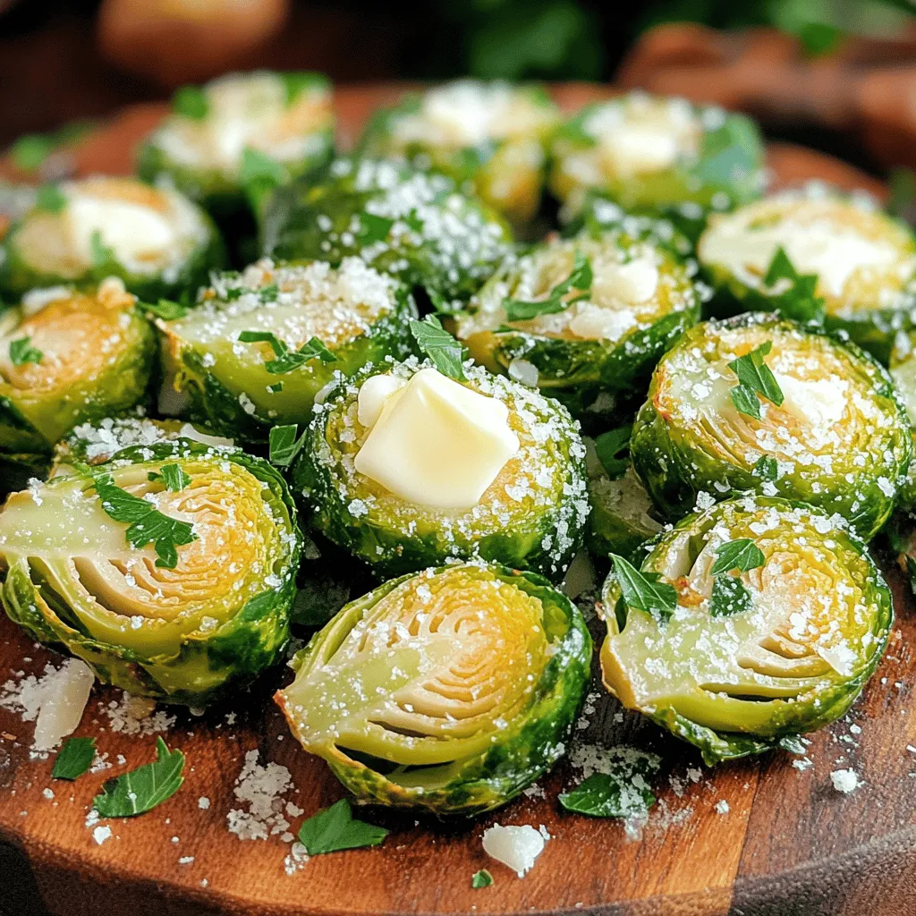 When the Brussels sprouts are done, take them out of the oven. Sprinkle 2 tablespoons of freshly grated Parmesan cheese on top while they are still hot. This will let the cheese melt slightly. Lastly, add some chopped fresh parsley for a pop of color and flavor. Serve them in a rustic bowl or on a wooden platter for a beautiful presentation. Drizzle any leftover garlic butter from the pan over the top for extra flavor.
