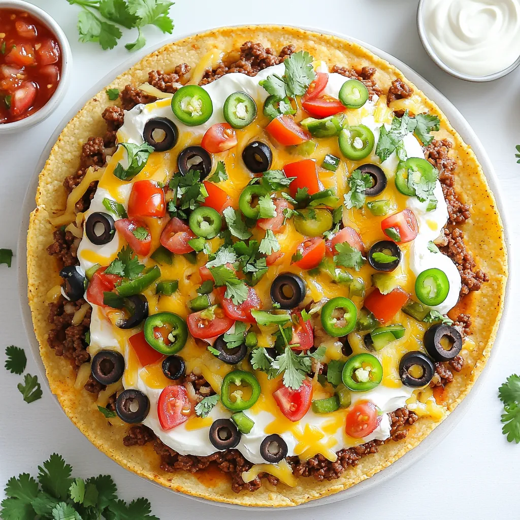 A delicious and easy-to-make Mexican pizza topped with seasoned beef, cheese, and fresh vegetables.