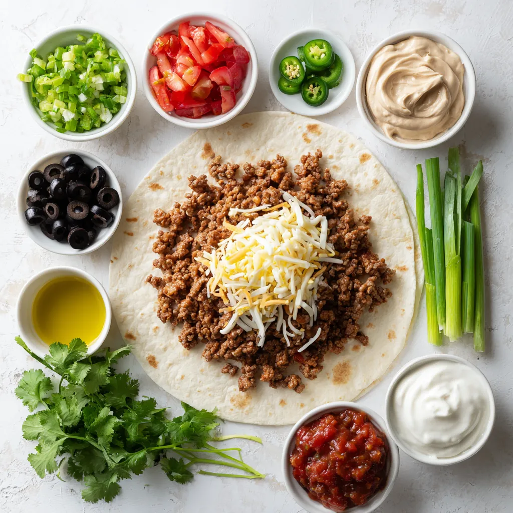 This list combines flavors and textures to create a delicious meal. Flour tortillas provide a soft but sturdy base. The refried beans add creaminess. Ground beef or turkey gives it a hearty bite. The cheese melts perfectly, making it a gooey delight. Fresh tomatoes and olives add brightness. Green onions bring crunch, while jalapeños add heat, if you like spice. Taco seasoning packs in flavor, while olive oil helps crisp the tortilla. Finally, fresh cilantro, salsa, and sour cream make great garnishes. Each ingredient plays a special role in making this dish truly tasty.