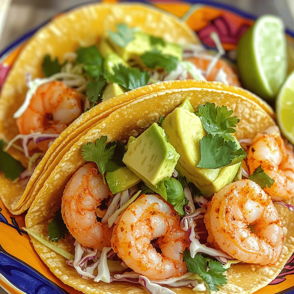Now, it’s time to build your tacos! Place a generous scoop of shrimp in the center of each warm tortilla. Top with shredded cabbage and a few slices of avocado. Finish with fresh cilantro for flavor and color. Serve with lime wedges on the side, adding a splash of freshness to each bite.