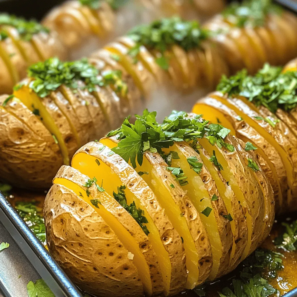 Now, preheat your oven to 425°F (220°C). Place the slitted potatoes on a baking sheet lined with parchment paper. Use a spoon or brush to coat each potato with the garlic herb butter. Make sure to get some butter between the slits. This step is key for flavor. Bake the potatoes for 40 to 45 minutes. Check that they are tender and crispy. Halfway through, brush more garlic herb butter on top. This adds extra flavor and color. After baking, let the potatoes cool slightly. Top them with fresh chopped parsley for a nice touch.