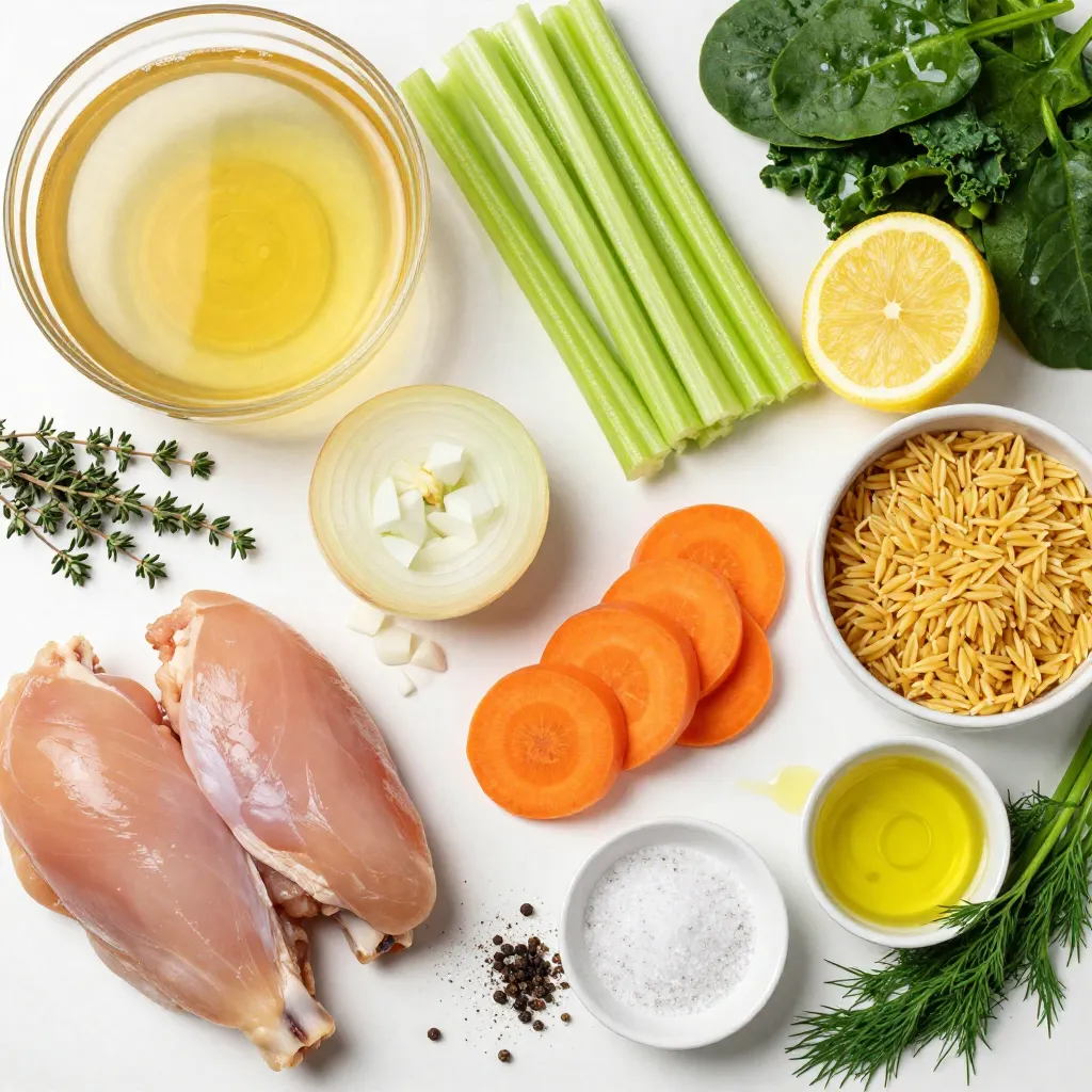 To make Greek lemon chicken soup, you need a few key items. Here’s the list: - 1 lb boneless, skinless chicken thighs - 8 cups chicken broth - 1 large onion, diced - 2 carrots, sliced - 2 celery stalks, chopped - 3 cloves garlic, minced - 1 large lemon (zest and juice) - 1 cup orzo pasta - 1 teaspoon dried oregano - 1 teaspoon dried thyme - Salt and pepper to taste - 2 tablespoons olive oil Each ingredient plays a big role in flavor. The chicken thighs give a rich taste and tender texture. The chicken broth forms a warm base. Onion, carrots, and celery add sweetness and depth. Garlic brings a nice punch. The lemon zest and juice add zesty brightness. Oregano and thyme offer that classic Greek flavor. You can make this soup even better with some optional ingredients. Here are a few ideas: - 2 cups fresh spinach or kale - Fresh dill, for garnish Adding spinach or kale boosts the soup with more nutrients and color. Fresh dill gives a lovely finish with its unique taste. You can mix and match these extras to find your perfect bowl of comfort. {{ingredient_image_1}} To start, heat 2 tablespoons of olive oil in a large pot over medium heat. Once hot, add the diced onion, sliced carrots, and chopped celery. Sauté these veggies for about 5-7 minutes. You want them soft but not mushy. Their natural sweetness adds depth to the soup. Next, add 3 cloves of minced garlic. Cook this for another minute until it smells great. This step builds a strong flavor base for your soup. Now it’s time for the chicken. Add 1 pound of boneless, skinless chicken thighs to the pot. Sprinkle in 1 teaspoon of dried oregano and 1 teaspoon of dried thyme. Season with salt and pepper to your taste. Cook the chicken for about 2-3 minutes until it’s lightly browned. This browning adds a nice color and flavor. Pour in 8 cups of chicken broth. Make sure the chicken is fully submerged. Bring this mixture to a boil, then reduce the heat. Let it simmer for 20 minutes, uncovered. This allows the chicken to cook through and the flavors to blend. After 20 minutes, remove the chicken from the pot. Use two forks to shred it into bite-sized pieces. Return the shredded chicken back into the soup. Now, it’s time to add the orzo. Toss in 1 cup of orzo pasta and cook it according to the package instructions, usually about 8-10 minutes. The orzo will absorb some of the broth, making it heartier. Once the pasta is cooked, stir in the zest and juice of one large lemon. This step is key for that zesty flavor. If you want to add a boost of nutrition, toss in 2 cups of fresh spinach or kale. Let it wilt in the heat of the soup for a few minutes. Finally, taste your soup. Adjust the seasoning with more salt, pepper, or lemon juice as needed. This ensures the flavors shine through. Serve the soup hot and garnish with fresh dill. This adds a lovely touch and extra flavor. Enjoy your warm bowl of Greek Lemon Chicken Soup! To make your chicken tender, choose boneless, skinless thighs. They stay juicy and cook well. Sauté them briefly with veggies to add flavor. Always season your soup with lemon. It brightens the taste and balances the richness of the broth. You want a zesty kick in each bite. Pair this soup with crusty bread or a fresh salad. They add texture and freshness. For garnishing, use fresh dill. It adds a pop of color and flavor. A sprinkle of lemon zest on top also looks nice. Enjoy your bowl of comfort! Pro Tips Use Fresh Herbs: Fresh dill and parsley can enhance the flavor profile of the soup significantly, giving it that authentic Greek taste. Mind the Orzo: Keep an eye on the orzo while cooking; it can quickly become mushy if overcooked. Add it towards the end of your cooking time. Adjust Lemon to Taste: The acidity of lemon can vary; start with half the juice, then taste and add more if you prefer a zippier flavor. Make it a Meal: For a heartier version, consider adding more vegetables like zucchini or bell peppers, or serve with crusty bread on the side. {{image_2}} You can change ingredients in Greek Lemon Chicken Soup to suit your taste. If you don’t have orzo, use rice or quinoa. Both add a nice texture and flavor. Rice takes a bit longer to cook, so keep an eye on it. Quinoa cooks faster and adds a nutty taste. For protein, try turkey or tofu. Turkey works well because it has a similar flavor to chicken. Just make sure to cook it fully before adding the broth. Tofu is a great choice for a vegetarian option. You can cube it and add it in when you add the orzo. Herbs and spices can really change the soup's taste. You can try adding fresh parsley or basil for a different twist. Cilantro gives a fresh kick as well. If you want some heat, add a pinch of red pepper flakes. Greek chicken soup has regional flavors, too. In some areas, they use a mix of lemon and vinegar. This gives a tangy taste that some people love. You can also find variations that use lentils instead of chicken. These changes keep the soup exciting and new every time you make it. To keep your Greek lemon chicken soup fresh, store it in an airtight container. This helps avoid any strong smells in your fridge. Let the soup cool before sealing it. The soup lasts up to four days in the fridge. If you want to keep it longer, try freezing it instead. Freezing Greek lemon chicken soup is easy! First, let the soup cool completely. Then, pour it into freezer-safe bags or containers. Leave some space at the top, as soup expands when frozen. You can freeze it for up to three months. To reheat, take it out of the freezer and thaw it overnight in the fridge. Then, heat it on the stove over medium heat. Stir it well to bring back the flavors. Enjoy a warm bowl of comfort! Can I use chicken breasts instead of thighs? Yes, you can use chicken breasts. They are leaner than thighs. However, they may not give as rich a flavor. Thighs add more moisture and taste to the soup. If you choose breasts, cook them carefully to avoid dryness. What makes Greek Lemon Chicken Soup di