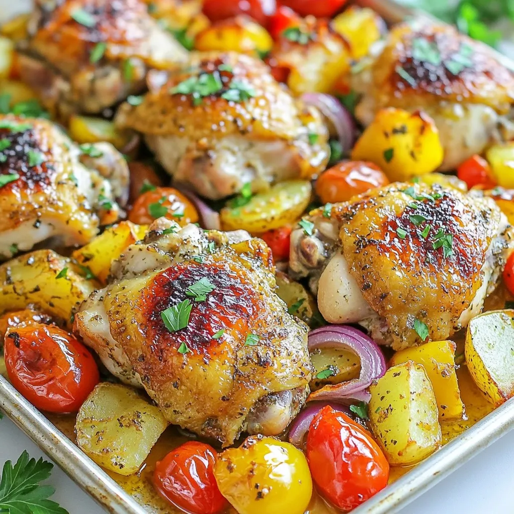 A delicious and easy one-pan meal featuring marinated chicken thighs and roasted vegetables.