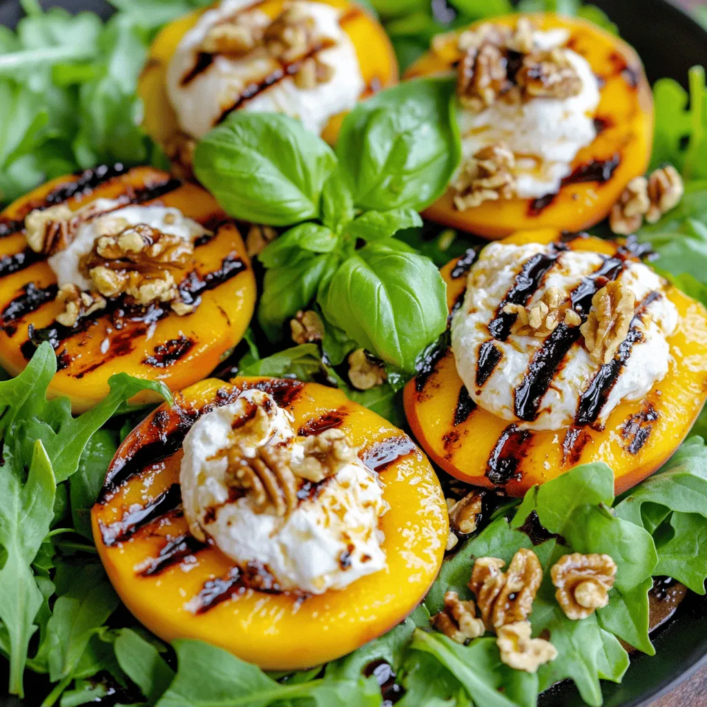 To make your salad look stunning, focus on color. Use a large, shallow bowl to show the layers. Start with mixed greens at the base. Then, arrange the grilled peach slices in a circle. Place torn burrata pieces in the center. Finish with chopped walnuts and a drizzle of balsamic glaze.
