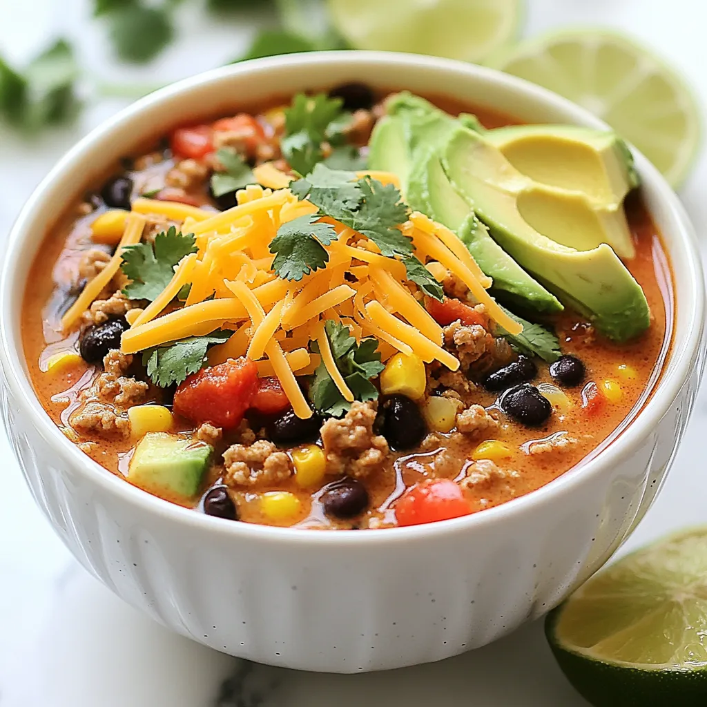 - Ground turkey or chicken - Greek yogurt In this soup, I love using ground turkey or chicken. They both add lean protein and keep the dish light. If you want more flavor, you can use chicken. It adds a rich taste to the soup. Greek yogurt is my secret for creaminess. It makes the soup smooth without heavy cream. Plus, it adds extra protein! - Black beans - Kidney beans - Diced tomatoes with green chilies - Corn - Onion and garlic Next, let’s talk about the veggies and legumes. Black beans and kidney beans pack a protein punch. They also add fiber, which keeps you full. Diced tomatoes with green chilies give a nice kick. Corn sweetens the mix and adds texture. Onions and garlic bring depth to the flavor. Sauté them first to unlock their rich taste. - Taco seasoning - Chicken or vegetable broth - Olive oil - Salt and pepper Now, for the seasonings and broth. Taco seasoning is key to that classic flavor. It blends perfectly with the other ingredients. I use chicken or vegetable broth to build the soup’s base. Olive oil helps sauté the onion and garlic. Don’t forget salt and pepper! They round out the flavors and make everything pop. This soup is not just tasty; it is also filling. It’s a warm hug in a bowl, perfect for any day! {{ingredient_image_1}} First, heat one tablespoon of olive oil in a large pot over medium heat. Add one diced onion and sauté it until it turns translucent, about 4 to 5 minutes. This step brings out the sweet flavor of the onion and sets a great base. Next, stir in three minced garlic cloves. Cook them for one more minute until they smell fragrant. Now, it’s time to add the protein. Place one pound of ground turkey or chicken into the pot. Cook it until it’s browned and fully cooked, about 6 to 7 minutes. Break the meat apart with a spatula as it cooks. This ensures even cooking and helps to mix it well with the onion and garlic. Once the meat is cooked, mix in one packet of taco seasoning. Stir well to coat the meat evenly with the spices. This gives the soup that classic taco flavor we love. Next, pour in four cups of chicken or vegetable broth. Add in one can of rinsed and drained black beans, one can of rinsed and drained kidney beans, one can of diced tomatoes with green chilies, and one can of drained corn. Stir everything together until it’s well combined. Bring the soup to a simmer. Cover the pot and let it cook for about 15 to 20 minutes. This time allows all the flavors to meld together and creates a rich, hearty soup. After simmering, remove the pot from heat. Now, stir in one cup of Greek yogurt until it’s fully mixed in. This step adds creaminess to the soup without using heavy cream. If the soup is too thick, you can add more broth until it reaches your desired texture. Finally, taste the soup and adjust the seasoning with salt and pepper as needed. This is your chance to make it perfect for your taste buds. Now, your high protein creamy taco soup is ready to serve! To boost the flavor of your soup, use fresh herbs like cilantro. Chop it finely and sprinkle it on top before serving. This adds a bright taste and a nice color. You can also adjust the spice level by adding more taco seasoning. If you want it spicier, try adding a pinch of cayenne or diced jalapeños. For extra creaminess, Greek yogurt is key. It makes the soup rich and smooth. If you want to switch things up, try cream cheese or sour cream instead. If your soup is too thick, add more broth. Stir in a little at a time until you reach your perfect texture. Toppings can make your soup even better. Add shredded cheese for richness, avocado slices for creaminess, and lime wedges for a zesty kick. Pair your soup with tortilla chips for crunch or a fresh salad for balance. These sides will bring your meal to the next level. Pro Tips Use Lean Meat: Opt for lean ground turkey or chicken to keep the soup healthy without sacrificing flavor. Customize the Heat: Adjust the spice level by choosing regular or hot taco seasoning, or add fresh jalapeños for an extra kick. Make it Vegetarian: Substitute the meat with extra beans or lentils for a delicious vegetarian version that still packs a protein punch. Garnish for Freshness: Fresh cilantro, avocado, and lime not only enhance the flavor but also add a refreshing touch to the soup. {{image_2}} You can swap ground turkey or chicken for other proteins. Tofu is a great choice for a plant-based option. Crumble firm tofu and cook it like the meat. It absorbs flavors well and makes the soup filling. If you prefer beef, use ground beef instead of turkey. This option brings a richer taste and hearty texture. To make the soup vegetarian or vegan, remove the meat and Greek yogurt. Use vegetable broth for a full flavor. You can add more beans or lentils to keep the protein high. For gluten-free options, check your taco seasoning. Some brands may contain gluten. Use certified gluten-free seasoning to keep it safe. Adding more vegetables can boost the soup's nutrition. Try bell peppers, zucchini, or spinach for extra color and taste. You can also adjust the spice levels. For mild flavor, use less taco seasoning. If you like heat, add jalapeños or hot sauce. Feel free to experiment with different flavors to make it your own! You can store High Protein Creamy Taco Soup in the fridge for about 3-4 days. Use an air-tight container to keep it fresh. Glass or plastic containers work well. Make sure the soup cools down before sealing it. This helps avoid moisture buildup, which can lead to spoilage. To freeze the soup, let it cool completely. Pour it into freezer-safe bags or containers. Leave some space at the top as the soup may expand. It is best to freeze it in smaller portions for easy use later. For thawing, place the soup in the fridge overnight. You can also use the microwave on low power for quick thawing. When you’re ready to enjoy your soup, there are a few ways to reheat it. You can use the stove for even heating. Just pour the soup into