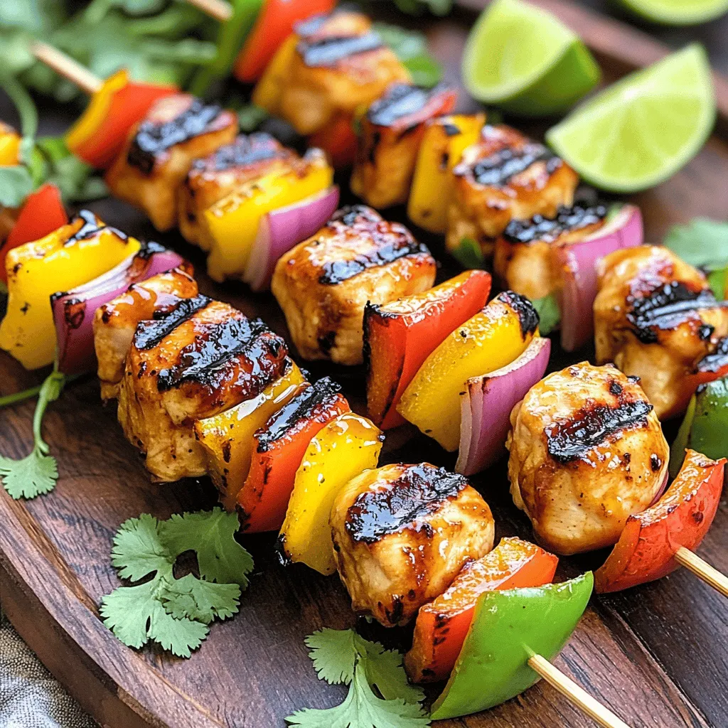 For these tasty kabobs, you will need: - 1 lb boneless, skinless chicken breasts, cut into 1-inch cubes - 1/4 cup honey - 2 tablespoons lime juice - 1 tablespoon lime zest - 2 tablespoons olive oil - 2 cloves garlic, minced - 1 teaspoon ground cumin - 1 teaspoon paprika - Salt and pepper to taste - 1 red bell pepper, cut into 1-inch pieces - 1 yellow bell pepper, cut into 1-inch pieces - 1 red onion, cut into wedges - Wooden skewers (soaked in water for 30 minutes if using) The chicken is the star of this dish. I prefer using boneless, skinless breasts for tenderness. Cut them into cubes for even cooking. The veggies add color and crunch. Red and yellow bell peppers bring sweetness. Red onion adds a nice bite. All these flavors work well with the honey lime marinade. When shopping, look for chicken that feels firm and has no smell. Fresh bell peppers should be bright and firm. Check for smooth skin and no spots. For the onion, pick ones that feel heavy. They should have no soft spots. Fresh ingredients make a big difference in taste. Always choose what looks and smells the best! To start, gather a medium bowl. Add 1/4 cup honey, 2 tablespoons lime juice, and 1 tablespoon lime zest. Next, pour in 2 tablespoons olive oil and toss in 2 cloves of minced garlic. Then, sprinkle in 1 teaspoon ground cumin and 1 teaspoon paprika. Finally, season with salt and pepper to taste. Mix everything well until it blends smoothly. This marinade will give your chicken a sweet and tangy flavor. Now, take your 1 pound of boneless, skinless chicken breasts. Cut them into 1-inch cubes. Place these cubes into the marinade you just made. Make sure each piece gets good coverage. Cover the bowl and put it in the fridge. Let the chicken marinate for at least 30 minutes. For even more flavor, you can marinate it for up to 2 hours. While your chicken marinates, prep your vegetables. Cut 1 red bell pepper, 1 yellow bell pepper, and 1 red onion into 1-inch pieces. Once your chicken is ready, take wooden skewers and soak them in water for about 30 minutes. This keeps them from burning on the grill. Now, start threading the marinated chicken and the vegetable pieces onto the skewers. Alternate between chicken and veggies for a colorful look. Preheat your grill to medium-high heat. When it’s hot, place the kabobs on the grill. Cook them for about 10 to 12 minutes. Turn the kabobs occasionally so they cook evenly. Use a meat thermometer to check the chicken. It should reach an internal temperature of 165°F (75°C). After grilling, let the kabobs rest for a few minutes. This helps keep them juicy and tasty. Enjoy your flavorful honey lime chicken kabobs! To grill perfect kabobs, preheat your grill to medium-high heat. This ensures even cooking and great grill marks. Soak wooden skewers in water for 30 minutes before using. This helps prevent burning. When threading the skewers, alternate chicken and vegetables. This mix adds flavor and color. Keep space between pieces for better heat flow. Use the marinade to boost flavor. Honey and lime create a sweet and tangy taste. The garlic adds depth, while cumin and paprika bring warmth. Marinade the chicken for at least 30 minutes. For more flavor, let it soak for up to 2 hours. You can also add herbs like cilantro or parsley for freshness. Always wash your hands before and after handling raw chicken. Use separate cutting boards for chicken and vegetables. This helps prevent cross-contamination. Cook chicken until it reaches 165°F (75°C). A meat thermometer takes the guesswork out of cooking. Let your kabobs rest for a few minutes after grilling. This keeps them juicy and safe to eat. {{image_2}} You can switch things up by using shrimp or tofu. Shrimp cooks fast and adds a nice touch. Just marinate it like chicken. Tofu, on the other hand, soaks up flavors well. Use firm tofu and press it first. Cut it into cubes and follow the same marinating steps. Both options will give you a tasty kabob. Feel free to mix in different veggies. Zucchini, mushrooms, and cherry tomatoes are great choices. Just cut them into similar sizes. You can also try adding pineapple for a sweet twist. The more colorful your kabobs, the more fun they look on the grill! If you like heat, spice it up! Add chili powder or hot sauce to your marinade. Sriracha or cayenne pepper work well too. Just start with a little and taste it. You can also include jalapeños on the skewers for extra kick. This adds bold flavors and keeps your taste buds excited! To store leftover kabobs, let them cool first. Place them in an airtight container. You can keep them in the fridge for up to three days. This keeps the flavors fresh and tasty. When you want to eat the kabobs again, reheating is easy. Use a microwave or an oven. For the microwave, heat for one to two minutes. If you use an oven, set it to 350°F (175°C). Heat for about ten minutes. Ensure they are warm throughout. This keeps them juicy and safe to eat. If you want to save kabobs for later, freezing works great. Wrap each kabob in plastic wrap. Then, place them in a freezer-safe bag. They can stay in the freezer for up to three months. When you are ready to eat them, thaw them in the fridge overnight. Then, reheat as needed. This way, you can enjoy your delicious kabobs anytime! You can serve these kabobs with many tasty sides. Fresh salad adds crunch and color. Fluffy rice pairs well with the sweet and tangy flavors. Grilled corn on the cob complements the meal nicely. You might also enjoy a zesty coleslaw for extra texture. Marinating chicken for at least 30 minutes works well. For a deeper flavor, marinate for up to 2 hours. The honey and lime mix gives the chicken a great taste. Just don’t go over two hours, as it can make the chicken too soft. Yes, you can make these kabobs in the oven! Preheat your oven to 400°F (200°C). Place the kabobs on a baking sheet lined with foil. Bake for about 15-20 minutes, turning halfway. Use a meat thermometer to check tha