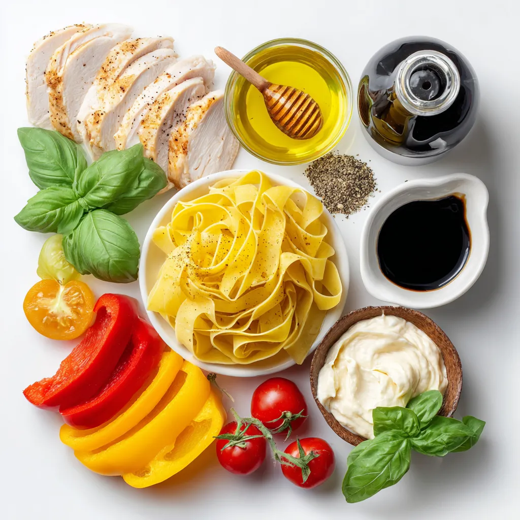 A delicious pasta dish featuring marinated chicken, bell peppers, and a creamy sauce with a hint of honey and pepper.