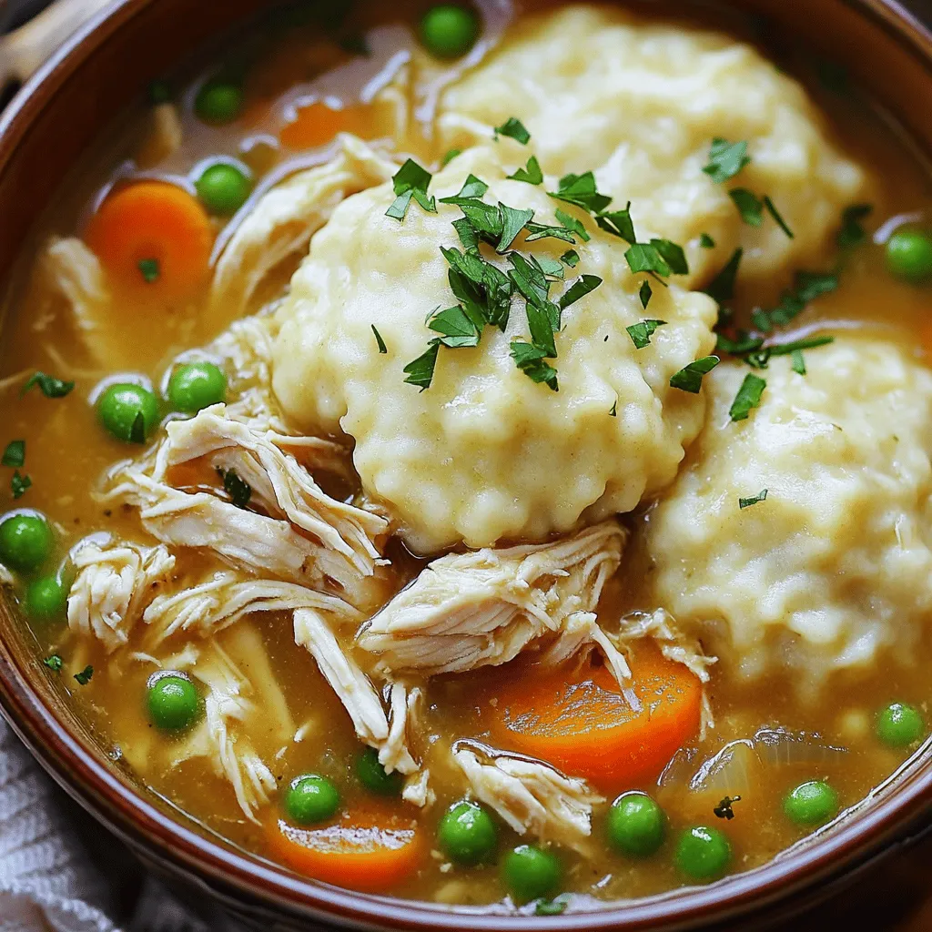 - 1.5 lbs boneless, skinless chicken thighs - 1 onion, finely chopped - 3 garlic cloves, minced - 2 cups chicken broth - 1 cup carrots, sliced - 1 cup celery, chopped - 1 teaspoon dried thyme - 1 teaspoon dried rosemary - Salt and pepper to taste - 1 cup frozen peas For this dish, I use chicken thighs because they stay juicy and tender. The onion and garlic add depth. The carrots and celery bring color and crunch. The thyme and rosemary give it a cozy flavor. Don't forget salt and pepper; they enhance the taste. The frozen peas add a nice pop of sweetness at the end. - 2 cups all-purpose flour - 1 tablespoon baking powder - 1 teaspoon salt - 1 cup milk - 2 tablespoons butter, melted These dumplings are fluffy and soft. The flour and baking powder make them rise. The salt brings out the flavor, while the milk and butter keep them moist. Mix them well for the best texture. - 1 tablespoon chopped fresh parsley Fresh parsley brightens up the dish. It adds color and a fresh taste. Just sprinkle it on top before serving for a lovely finish. - Set your Instant Pot to sauté mode. - Add some oil. Once hot, toss in the chopped onion. - Sauté for about 3-4 minutes until soft. - Next, add the minced garlic. Cook for 1 more minute until fragrant. - Season the chicken thighs with salt, pepper, thyme, and rosemary. - Place the seasoned chicken into the Instant Pot. - Pour in the chicken broth. Add the sliced carrots and chopped celery. - Close the lid and set the Instant Pot to cook on high pressure for 10 minutes. - After cooking, let the pressure release naturally for 10 minutes. - Carefully do a quick release to remove any remaining pressure. - Take out the chicken thighs and shred them with two forks. - Put the shredded chicken back in the pot. Stir in the frozen peas. - In a bowl, mix the flour, baking powder, and salt. - Gradually add in the milk and melted butter. Mix until a soft dough forms. - Drop spoonfuls of the dumpling dough on top of the chicken mixture. - Make sure not to stir. Close the lid again. - Set to high pressure and cook for 5 minutes. - Once done, do a quick release. - Serve hot, garnished with chopped fresh parsley. To make your chicken and dumplings shine, adjust the seasoning to fit your taste. Start with salt and pepper; add more if needed. You can also include extra herbs or spices. Try adding garlic powder or a pinch of paprika for a warm kick. Fresh herbs like thyme or rosemary can enhance the dish's aroma. Experiment until you find your perfect balance, and don’t be afraid to taste as you go. Common mistakes can ruin your dumpling texture. Avoid overmixing the dough; it should be soft and slightly sticky. If your dough is too dry, add more milk gradually. If too wet, sprinkle in more flour. Check the consistency by dropping a spoonful onto the chicken mixture. It should hold its shape. Remember, fluffy dumplings need a light touch. Different Instant Pot models may vary in cooking times. If yours cooks faster, reduce the time by a minute or two. For larger batches, increase the cooking time slightly to ensure everything cooks through. Always check the chicken’s internal temperature; it should reach 165°F for safety. Adjusting these times can make your dish perfect every time. {{image_2}} You can make this dish healthier by using leaner cuts of chicken. Chicken breasts work well and have less fat. Another option is to use low-fat milk or non-dairy alternatives like almond or oat milk. These choices cut down on calories while still keeping the dish creamy and tasty. Don’t be afraid to mix things up with your vegetables. You can add peas or corn for a pop of color and sweetness. If you like a little heat, sprinkle in some red pepper flakes or Cajun seasoning. These additions can take the flavor to a new level, making your meal even more enjoyable. If you need a gluten-free option, use gluten-free flour for your dumplings. This keeps the dish friendly for those with gluten sensitivities. For thickening the broth, you can use cornstarch or arrowroot powder instead of regular flour. This way, you keep the same great taste without the gluten. To store leftovers, place chicken and dumplings in an airtight container. Keep them in the fridge. They will stay fresh for about three to four days. Make sure to let them cool before sealing the container. This helps avoid soggy dumplings. You can freeze chicken and dumplings for longer storage. Use freezer-safe containers or bags. Remove as much air as possible to prevent freezer burn. They can last up to three months in the freezer. When you are ready to enjoy them, thaw overnight in the fridge. Reheat in a pot on low heat, stirring gently. Add a splash of chicken broth if needed to keep them moist. Making chicken and dumplings ahead of time is easy. Prepare the whole dish and store it in portions. You can use small containers for single servings. This way, you have quick meals ready to go. It saves time and effort on busy days. Just reheat and enjoy! Cooking this dish takes about 45 minutes. You will spend 15 minutes prepping. The cook time is 10 minutes for the chicken. Then you need 5 minutes for the dumplings. Allow for 10 minutes of natural pressure release. Yes, you can use frozen chicken. Just remember to add a few extra minutes to the cook time. Frozen chicken thighs will need about 12 to 15 minutes under high pressure. Ensure the pieces are not stuck together for even cooking. Chicken and dumplings is a complete meal. However, you can pair it with simple sides. Consider a fresh green salad for a light touch. Breadsticks or crusty bread are also great for dipping in the broth. Definitely! You can swap the chicken for plant-based protein. Tofu or chickpeas work well. Use vegetable broth instead of chicken broth. You can also add more veggies for extra flavor and nutrition. In this post, we covered how to make Instant Pot Chicken and Dumplings. I shared key ingredients, step-by-step instructions, and tips for flavor and 