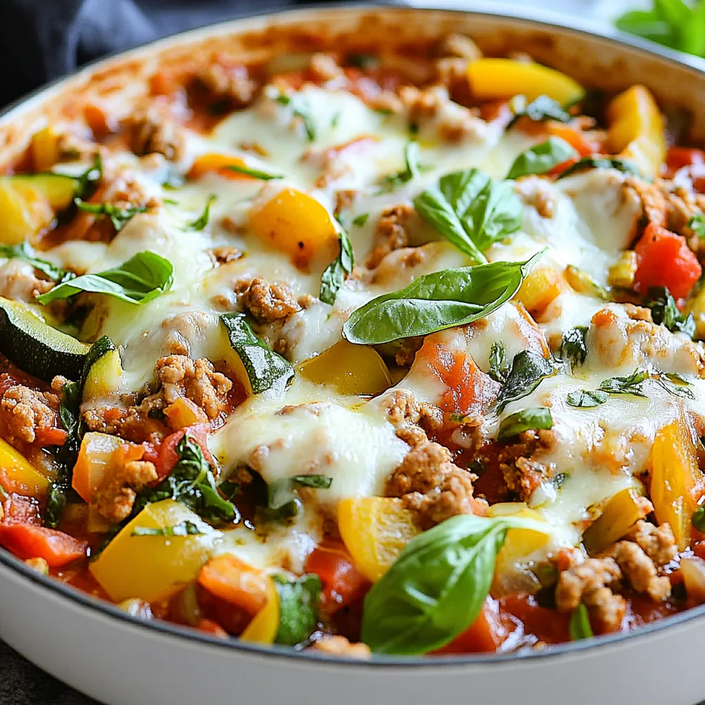 A flavorful and healthy skillet dish featuring ground turkey and fresh vegetables, topped with melted mozzarella cheese.