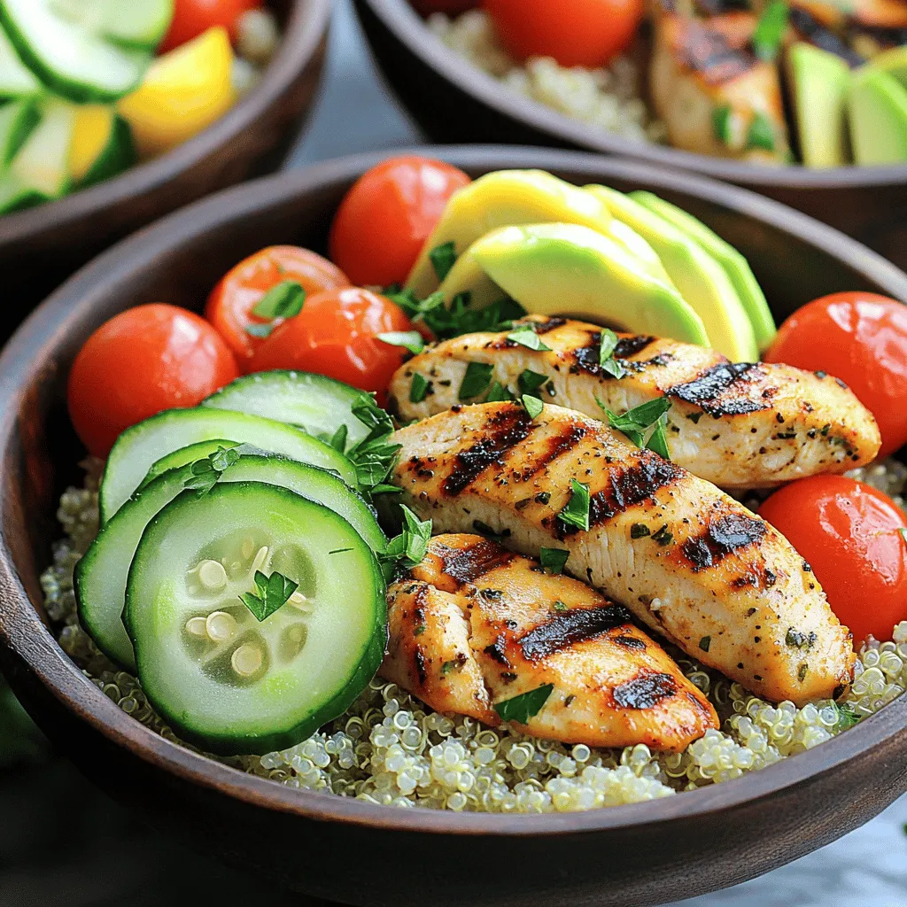 Chicken and Marinade Components - 4 boneless, skinless chicken breasts - 1/4 cup olive oil - 3 tablespoons lemon juice (freshly squeezed) - Zest of 1 lemon - 3 cloves garlic, minced - 1 tablespoon honey - 2 teaspoons dried oregano - 1 teaspoon dried thyme - Salt and pepper to taste These ingredients create a bright and zesty flavor in the chicken. The olive oil adds richness, while the lemon juice and zest provide a fresh tang. Honey balances the acidity and keeps the chicken moist. Garlic, oregano, and thyme give depth to the marinade. Quinoa and Vegetable Toppings - 2 cups cooked quinoa - 1 cup cherry tomatoes, halved - 1 cucumber, diced - 1 avocado, sliced Quinoa serves as a hearty base. It adds protein and fiber, making the meal filling. Cherry tomatoes bring sweetness and color, while cucumber adds crunch. Avocado gives a creamy texture that complements the grilled chicken perfectly. Garnishing Ingredients - Fresh parsley or cilantro for garnish Using fresh herbs uplifts the dish. They add a pop of color and a burst of flavor. Choose your favorite herb to make it your own. This combination of ingredients makes Lemon Herb Grilled Chicken Bowls a delightful meal. The flavors work together to create a satisfying and healthy dish. To start, grab a large bowl. You will whisk together the olive oil, lemon juice, lemon zest, minced garlic, honey, oregano, thyme, salt, and pepper. This mix becomes your flavor-packed marinade. Next, add the chicken breasts to the bowl. Make sure each piece is coated well. Cover the bowl and place it in the fridge for at least 30 minutes. If you have time, let it marinate for up to 2 hours. This extra time helps the flavors soak in. While the chicken marinates, prepare your grill. Preheat it to medium-high heat. This way, you get nice grill marks and a juicy chicken. Now it’s time to grill the chicken. Remove it from the marinade and toss the leftover marinade. Place the chicken on the grill. Cook each side for about 5-7 minutes. You want the chicken’s internal temperature to reach 165°F (75°C). To check for doneness, use a meat thermometer. If you don’t have one, cut into the thickest part of the chicken. It should be white and juicy inside, not pink. After grilling, let the chicken rest for 5 minutes. This helps keep it juicy. Slice the chicken into strips. Now, let’s build your bowl! Start with a base of cooked quinoa. Top it with the grilled chicken strips. Add cherry tomatoes, diced cucumber, and avocado slices. For a pop of color and flavor, garnish with fresh parsley or cilantro. You can also drizzle some extra olive oil or a squeeze of lemon over the top for added zest. Serve it all in vibrant bowls for a fun meal presentation. - Best Practices for Flavor Infusion: To get the best taste, mix the marinade well. Use a large bowl to whisk the olive oil, lemon juice, zest, garlic, honey, oregano, thyme, salt, and pepper. Make sure the chicken breasts are fully covered. This helps the flavors soak in deeply. - Recommended Marination Time: I suggest marinating the chicken for at least 30 minutes. For a stronger taste, you can marinate for up to 2 hours. Just keep it in the fridge during this time. - Avoiding Dry Chicken: To keep the chicken juicy, don’t overcook it. Grill on medium-high heat. Cook for about 5-7 minutes on each side. Use a meat thermometer to check for doneness. The chicken should reach 165°F (75°C). - Tools for a Perfect Grill: Use a good grill or grill pan. Tongs help flip the chicken easily. A meat thermometer is key for checking the right temperature. - Additional Pairings: Consider adding a simple salad or roasted veggies on the side. This adds color and nutrition to your meal. You can also include a light dressing to enhance flavors. - Making it a Complete Meal: Serve the chicken over quinoa and add the cherry tomatoes, cucumber, and avocado. This gives you a balanced meal full of protein, healthy fats, and carbs. Garnish with fresh parsley or cilantro for a nice touch. {{image_2}} Alternative Proteins You can swap chicken for other proteins. Try turkey, shrimp, or tofu. Each offers a unique taste. Turkey gives a lean option. Shrimp adds a seafood twist. Tofu is great for a plant-based meal. Just adjust the cooking time as needed. Gluten-Free Options Quinoa is naturally gluten-free, making this dish safe for gluten-free eaters. If you want more grains, use rice or millet. Both are gluten-free and cook well. Check labels on sauces and marinades to ensure they are gluten-free. Adding Heat with Spices Want some spice? Add red pepper flakes or cayenne pepper to your marinade. A pinch gives a nice kick. You can also use fresh jalapeños for a fresh heat. Mix in as much as you like to fit your taste. Fresh Herbs and Seasoning Ideas Fresh herbs can lift your dish. Try basil or dill for a twist. You can also mix thyme with rosemary for a robust flavor. These herbs add freshness and bright tastes to your bowl. Summer Vegetable Options In summer, fresh veggies shine. Add grilled zucchini or corn for a sweet crunch. Bell peppers also work well. They add color and flavor. Use what is in season for the best taste. Fall Enhancements In the fall, consider roasted butternut squash or Brussels sprouts. Their sweetness pairs well with the lemon herb chicken. You can also toss in some kale or spinach for extra greens. These toppings bring warmth and heartiness to your meal. How to Store Leftovers Store your Lemon Herb Grilled Chicken Bowls in airtight containers. This keeps them fresh and tasty. Make sure to let the bowls cool to room temperature before sealing. If you have extra chicken, store it separately from the veggies and quinoa. This helps maintain the best flavor and texture. Shelf Life of Ingredients When stored correctly, your grilled chicken will last up to four days in the fridge. The cooked quinoa can hold up for about five days. Fresh veggies like tomatoes and cucumbers should be consumed within three days for the best taste.