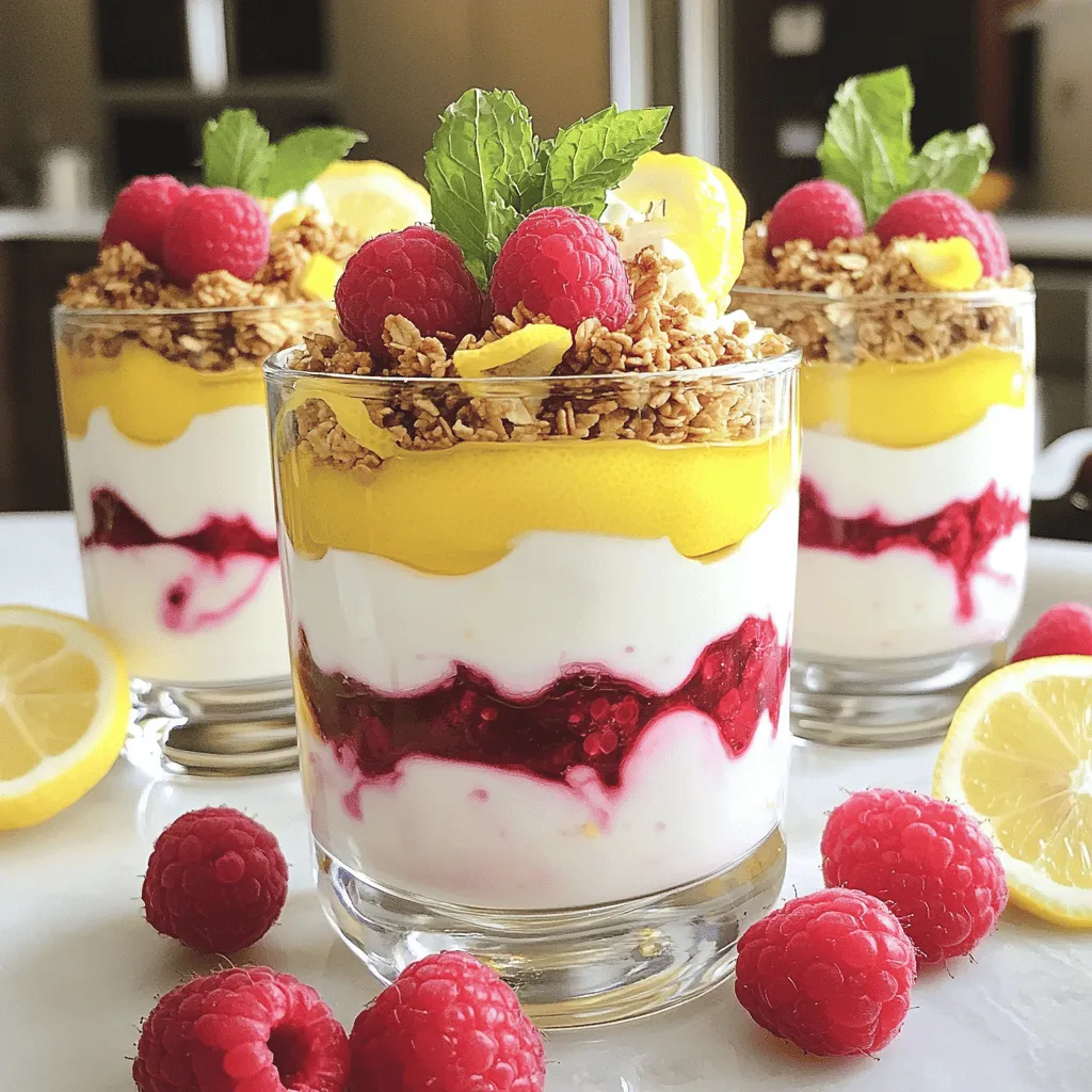 - 2 cups Greek yogurt - 2 tablespoons honey (or to taste) - Zest of 1 lemon - 2 tablespoons lemon juice - 1 cup fresh raspberries (plus extra for garnish) - 1 cup granola (choose your favorite) - Mint leaves for garnish (optional) The main ingredients create a fresh and tasty treat. Greek yogurt gives a creamy base. Honey adds sweetness and balances the tartness. Lemon zest and juice bring bright flavor. Fresh raspberries offer a juicy burst in each bite. Granola adds a crunchy texture. Mint leaves can add a lovely touch on top. - Additional honey for drizzling - Alternative sweeteners You can customize your parfaits with optional ingredients. If you want more sweetness, drizzle extra honey on top. You can also use other sweeteners like agave syrup or maple syrup. These choices let you make the parfaits just right for your taste. To start, I love combining the Greek yogurt with honey, lemon zest, and lemon juice. This mix creates a bright, tangy flavor. Stir the ingredients until they blend well and become creamy. This yogurt mix is the star of your parfait. Next, grab your serving glasses or bowls. Begin layering by adding that smooth lemon yogurt mix at the bottom. This base sets the stage for what’s to come. Now, add a layer of fresh raspberries on top of the yogurt. The vibrant red of the fruit is so inviting. Then, sprinkle a layer of granola. Press it down gently. This helps the layers stick together nicely. Repeat these steps. Keep building until your glasses are full. Finish with one last layer of yogurt on top. Layering is key to a stunning parfait. I suggest starting with yogurt, then fruit, and finally granola. This order keeps everything neat and tasty. To achieve even layers, use a spoon or small scoop. This helps you control the amount you add. You want each layer to look pretty and be balanced. For the best presentation, serve the parfaits chilled. It enhances the flavors and makes each bite refreshing. Place them on a decorative platter for a nice touch. Add a slice of lemon on the edge of each glass. This simple garnish adds a lovely pop of color. Top the parfaits with extra raspberries and mint leaves if you like. A drizzle of honey can add a sweet finish, too. Enjoy your delicious creation! Choosing the right yogurt I love using Greek yogurt for parfaits. It has a thick, creamy texture. Greek yogurt is high in protein, which keeps you full. Choose plain yogurt to control the sweetness. You can also use flavored yogurt if you like it sweeter. Adjusting sweetness to taste Start with two tablespoons of honey. Mix it into the yogurt. Taste it and see if you need more. You can add more honey if you like it sweeter. Remember, the raspberries also bring natural sweetness, so adjust carefully. Serving chilled vs. room temperature Serving parfaits chilled makes them refreshing. Chill your glasses before serving. It enhances the flavors and gives a nice crisp bite. Room temperature is fine, but chilled is best for this dessert. Using decorative garnishes Add extra raspberries on top for color. A sprig of mint makes it look fancy. You can also place a lemon slice on the glass edge. These small touches make your parfaits eye-catching and fun. Nutritional benefits of Greek yogurt Greek yogurt is rich in protein, calcium, and probiotics. These nutrients help with digestion and bone health. It can also aid in muscle recovery after exercise. Eating Greek yogurt supports a healthy diet. Antioxidants in raspberries Raspberries are full of antioxidants. They help fight free radicals in our bodies. This can lower the risk of some diseases. Raspberries are also low in calories and high in fiber, making them a great choice for snacks and desserts. {{image_2}} You can switch up the raspberries with other fruits. Strawberries add a sweet touch. Blueberries bring a nice burst of flavor. Both fruits pair well with lemon. They also keep the parfait fresh and vibrant. If you prefer non-dairy options, use plant-based yogurts. Almond, coconut, or soy yogurt work great. They provide similar creaminess and taste. Just make sure they have a thick texture for best results. You can change the sweetness level easily. Try flavored yogurts like vanilla or coconut for a twist. You can also drizzle maple syrup or agave for a different flavor. This keeps your parfaits exciting and tailored to your taste. To keep your leftover parfaits fresh, cover them tightly. Use plastic wrap or a lid on the container. Store them in the fridge. They stay good for about two days. After that, the granola may get soggy. If you want to keep the crunch, store granola separately. You can freeze parfaits, but some parts change. The yogurt will freeze well, but raspberries may become mushy. To freeze, first layer the parfaits in a freezer-safe container. Leave some space at the top for expansion. Seal it tightly. You can freeze them for up to one month. When ready, thaw in the fridge overnight. Parfaits are best served cold. If you stored them in the fridge, just take them out. Let them sit for a few minutes to warm slightly. If you want to add more crunch, sprinkle on fresh granola just before serving. This keeps your parfaits tasty and fresh! For parfaits, Greek yogurt is my top choice. It is thick and creamy, which gives great texture. Regular yogurt is fine, too, but it may be runny. Greek yogurt also has more protein, which is a plus. These parfaits can last about 2-3 days in the fridge. They taste best fresh, but they still hold up well for a bit. Just keep them covered to avoid drying out or soaking the granola. Yes, you can prep these parfaits ahead. Just layer the yogurt and berries, but keep the granola separate. Add the granola right before serving to keep it crunchy. This way, you can enjoy fresh parfaits anytime! To recap, we explored how to make Lemon Raspberry Yogurt Parfaits. We covered key ingredients, preparation steps, and tips for presentation. I shared ideas for variations, storage methods, and answered commo