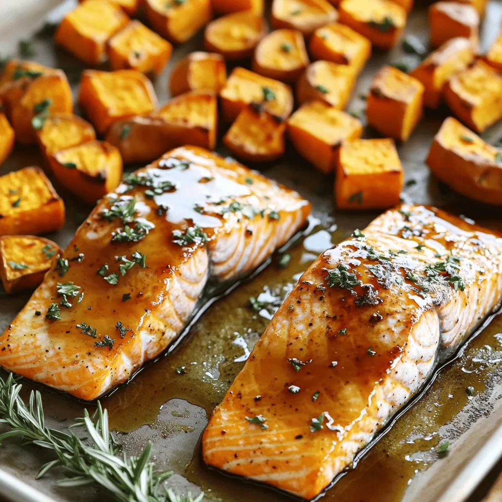 - 4 salmon fillets - 2 medium sweet potatoes, peeled and cubed - 1/4 cup pure maple syrup - 2 tablespoons Dijon mustard - 2 tablespoons olive oil - 1 teaspoon garlic powder - 1 teaspoon smoked paprika - Salt and pepper to taste - 1 tablespoon fresh rosemary, chopped (or 1 teaspoon dried) - 1 tablespoon fresh parsley, chopped (for garnish) Each serving of Maple Glazed Salmon and Sweet Potatoes has about: - Calories: 450 - Protein: 30g - Carbohydrates: 35g - Fat: 20g - Fiber: 5g - Sugars: 10g This dish offers a good balance of protein and healthy carbs. The salmon is rich in omega-3s, great for heart health. Sweet potatoes bring fiber and vitamins, making this meal nourishing. When choosing salmon, look for bright color and firm texture. Fresh salmon should smell like the ocean, not fishy. You can pick wild-caught for a more robust flavor or farmed for sustainability. For sweet potatoes, go for ones that are firm and smooth. Avoid any with soft spots or blemishes. A deep orange color inside means they are sweet and nutritious. These simple tips will help you pick the best ingredients for your dish. Enjoy the flavors that come from fresh, high-quality food! First, set your oven to 425°F (220°C). This high heat helps cook the salmon and sweet potatoes fast. While the oven heats up, grab a large sheet pan. Line it with parchment paper. This will make cleanup a breeze later. In a large bowl, mix the maple syrup, Dijon mustard, and olive oil. Add the garlic powder, smoked paprika, salt, and pepper. Stir until everything is well blended. This glaze will give your salmon a sweet and tangy flavor. Next, add the cubed sweet potatoes to the bowl with the glaze. Toss them until they are all coated. Spread the sweet potatoes out on one side of the sheet pan. Place the salmon fillets on the other side. Brush each fillet with any leftover glaze. Don’t forget to sprinkle fresh chopped rosemary on top for a nice touch. Now, it's time to bake! Place the pan in the oven for 20-25 minutes. You want the salmon to flake easily with a fork. The sweet potatoes should be tender and caramelized. When done, take the pan out and let it rest for a few minutes. Drizzle any extra glaze over the top before serving. Enjoy your delicious meal! To get the best salmon, choose fillets that are even in thickness. This helps them cook evenly. I recommend using skin-on salmon. The skin keeps the fish moist. Cook the salmon on a high heat. This gives you a nice crispy edge. Bake it until it flakes easily with a fork. This usually takes 20 to 25 minutes. Always let the salmon rest for a few minutes after cooking. This helps keep it juicy. For sweet potatoes, cube them evenly. This ensures they cook at the same rate. Toss them well in the glaze before baking. This gives them a nice coating. Spread them out in a single layer on the pan. Avoid crowding them, so they can caramelize. Bake them until they are tender and golden brown. This usually takes about 20 to 25 minutes. If they need more color, turn on the broiler for a minute or two. Just watch them closely to prevent burning. Store any leftovers in an airtight container. Place them in the fridge and use them within three days. To reheat, place the salmon and sweet potatoes in an oven-safe dish. Cover it with foil to keep moisture. Heat at 350°F (175°C) until warmed through. This helps maintain the flavors and texture. You can also enjoy the leftovers cold in a salad or wrap. {{image_2}} You can switch up the glaze for your salmon. Try honey or brown sugar. Both add a sweet touch. For a spicy kick, mix in some Sriracha. This gives a nice heat. You can also use soy sauce for a savory twist. Mixing maple syrup with soy sauce creates a great balance of sweet and salty. To make this meal even better, add more veggies. Broccoli or asparagus work well. They roast nicely and add color. Carrots or bell peppers are also great choices. Just toss them with the same glaze. This way, all your veggies share the same tasty flavor. You can use other fish instead of salmon. Try trout or halibut for a light taste. Both cook in a similar way. They pair well with the maple glaze too. Cod is another good option. Just keep an eye on the cooking time. Different fish may cook faster or slower than salmon. To store your maple glazed salmon and sweet potatoes, let them cool first. Place the leftovers in an airtight container. This keeps them fresh for up to three days. If you have extra glaze, store it in a small jar. It adds great flavor when reheating. You can freeze this dish too! Wrap the salmon and sweet potatoes tightly in plastic wrap. Then, place them in a freezer-safe bag. This helps prevent freezer burn. You can keep them frozen for up to three months. Just remember to label the bag with the date. To reheat, take the salmon and sweet potatoes out of the fridge or freezer. If frozen, let them thaw overnight in the fridge. Preheat your oven to 350°F (175°C). Place the food on a baking sheet. Cover it with foil to keep moisture in. Heat for about 15-20 minutes, or until warm. This method helps keep the salmon juicy and the sweet potatoes soft. Enjoy your tasty meal again! Yes, you can try honey or agave nectar. Both add sweetness but change the flavor. Honey brings a floral note, while agave is milder. If you switch, adjust the amount to taste. You can serve a fresh salad or steamed broccoli. These add color and crunch. Quinoa or rice works well too, for extra carbs. Lemon wedges brighten the dish, enhancing the flavor of the salmon. Check if the salmon flakes easily with a fork. It should be opaque and warm throughout. The internal temperature should reach 145°F (63°C). Use a meat thermometer for best results. You learned how to make maple glazed salmon and sweet potatoes. We covered key ingredients, nutrient facts, and tips for the best quality. I shared step-by-step ways to make this dish, including a tasty glaze and cooking details. We also talked about achieving perfect textures and