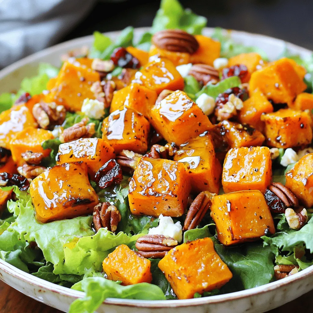 For this salad, you need: - 2 medium sweet potatoes, peeled and cubed - 2 tablespoons olive oil - 3 tablespoons pure maple syrup - Salt and pepper to taste - 1 teaspoon cinnamon Sweet potatoes bring a nice sweetness. The olive oil helps them roast well. Maple syrup gives a lovely glaze. Salt and pepper add flavor. Cinnamon adds warmth and depth. You will also need: - 1 cup mixed salad greens (spinach, arugula, or your choice) - 1/2 cup pecans, toasted Mixed greens add freshness. Spinach or arugula works great. Toasted pecans give a nice crunch. They add a nutty flavor that pairs well with sweet potatoes. To make it even better, you can add: - 1/2 cup crumbled feta cheese - 1/4 cup dried cranberries - 2 tablespoons apple cider vinegar - 1 tablespoon Dijon mustard Feta adds creaminess and tang. Dried cranberries bring a fruity note. The apple cider vinegar and Dijon mustard make a simple, tasty dressing. These additions create a balance of flavors in the salad. Start by peeling the sweet potatoes. Then, cut them into small cubes. This size helps them cook evenly. Next, place the cubed sweet potatoes in a mixing bowl. Add two tablespoons of olive oil, three tablespoons of pure maple syrup, salt, pepper, and one teaspoon of cinnamon. Toss the sweet potatoes well. You want them fully coated in the mixture. Preheat your oven to 400°F (200°C). Spread the sweet potatoes on a parchment-lined baking sheet in a single layer. This helps them roast well. Place the tray in the oven and roast for about 25 to 30 minutes. Toss them halfway through to ensure even cooking. They should be tender and caramelized when done. While the sweet potatoes roast, grab a small bowl. Whisk together two tablespoons of apple cider vinegar and one tablespoon of Dijon mustard. This simple dressing adds great flavor to the salad. Make sure it blends well. Set the dressing aside until the sweet potatoes are ready. Once the sweet potatoes cool for a few minutes, it’s time to assemble your salad. In a large salad bowl, combine one cup of mixed salad greens, the roasted sweet potatoes, and half a cup of toasted pecans. If you like, add half a cup of crumbled feta cheese for extra flavor. Toss in a quarter cup of dried cranberries for sweetness. Finally, drizzle the salad dressing over everything and gently toss to combine. Enjoy your colorful and tasty salad! Roasting the sweet potatoes brings out their natural sweetness. First, cut them into even cubes. This helps them cook at the same speed. Spread the cubes on a parchment-lined sheet. Make sure they are in a single layer. This way, they roast evenly. Toss them halfway through cooking for the best results. Bake at 400°F for about 25 to 30 minutes. They should be tender and lightly caramelized. To make the sweet potatoes shine, use a good mix of flavors. Toss them with olive oil, maple syrup, salt, and pepper. Add a teaspoon of cinnamon for warmth. The cinnamon pairs well with sweet potatoes. You can taste the sweet and spicy notes in every bite. This mix gives your salad a lovely, rich flavor. A beautiful salad makes the meal even better. Serve it in a large shallow bowl for a family-style meal. For individual servings, use nice plates. Top the salad with extra pecans and feta for crunch and creaminess. A drizzle of maple syrup adds a glossy finish. You can also sprinkle some dried cranberries on top for color. This makes the salad pop on the table! {{image_2}} You can easily make this salad vegetarian or vegan. To do this, skip the feta cheese. Instead, add some avocado for creaminess. You can also use a vegan salad dressing. A mix of olive oil and lemon juice works well. This keeps the salad fresh and tasty. If you want to switch up the nuts, walnuts or almonds are great choices. They add crunch and flavor. For fruits, try using apple slices or pomegranate seeds. These can give a nice burst of sweetness. You can mix and match to find your favorite combo. You can use different greens in this salad. If you want a peppery taste, arugula is a good option. Kale adds a hearty feel. If you like mild greens, use romaine or butter lettuce. Each green will change the flavor and texture of your salad. After enjoying your Maple Roasted Sweet Potato Pecan Salad, store leftovers in an airtight container. This keeps the salad fresh and tasty. The salad holds well for up to three days in the fridge. If you want to warm the sweet potatoes, do so gently. Use a microwave or oven. Heat them until just warm to keep the salad fresh. Avoid reheating the greens and nuts, as they should stay crisp. To keep your salad fresh, store the dressing separately. Combine it when you're ready to eat. This step helps keep the greens crisp and prevents wilting. Also, if you can, add nuts just before serving for extra crunch. Yes, you can prep some parts ahead. Roast the sweet potatoes and store them. Keep the salad greens and dressing separate in the fridge. Mix everything together when you are ready to serve. This keeps the salad fresh and crisp. You can try many dressings. A simple balsamic vinaigrette works well. A honey mustard dressing can add a nice twist. You can even use a yogurt-based dressing for creaminess. Just pick what you enjoy most! Yes, this salad is already gluten-free! All the ingredients are free from gluten. Just check any dressings or extras to ensure they are also gluten-free. Enjoy without worry. Absolutely! Grilled chicken, chickpeas, or tofu are great options. They add protein and make the salad more filling. Choose what you like best for a healthy boost. To make this salad vegan, skip the feta cheese. You can add more nuts or seeds for creaminess. Also, check your dressing to ensure it is vegan-friendly. There are many tasty options out there! Store leftovers in an airtight container. Keep the salad greens and dressing separate to avoid sogginess. The roasted sweet potatoes can stay with the other ingredients. They last for about 2-3 days in the fridge. Yes, fresh herbs add grea