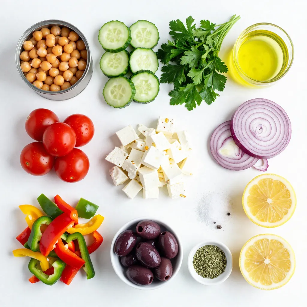 Rinse the chickpeas well. This helps remove extra salt. Chop the tomatoes, cucumber, and bell peppers into small pieces. Finely chop the red onion. Slice the olives. If you use feta cheese, crumble it into small bits. Lastly, chop the parsley to add a fresh touch.