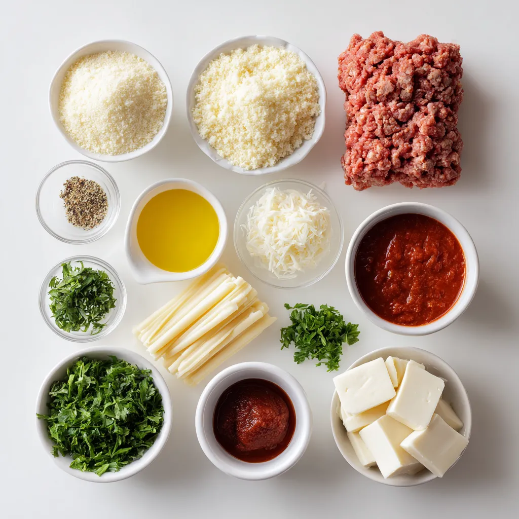 To make mozzarella stuffed meatloaf, start by gathering all your ingredients. You need ground beef, ground turkey, breadcrumbs, parmesan cheese, and fresh parsley. Don’t forget the egg, garlic, onion powder, oregano, salt, black pepper, marinara sauce, mozzarella cheese, and olive oil. This recipe takes about 20 minutes to prep and 60 minutes to bake.
