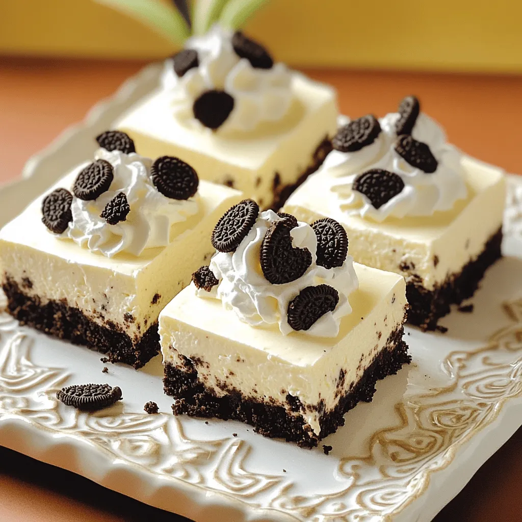 For an attractive display, serve the cheesecake bars on a colorful platter. You can add a dollop of whipped cream on each bar for a nice touch. Consider placing whole Oreo cookies alongside the bars for added flair.