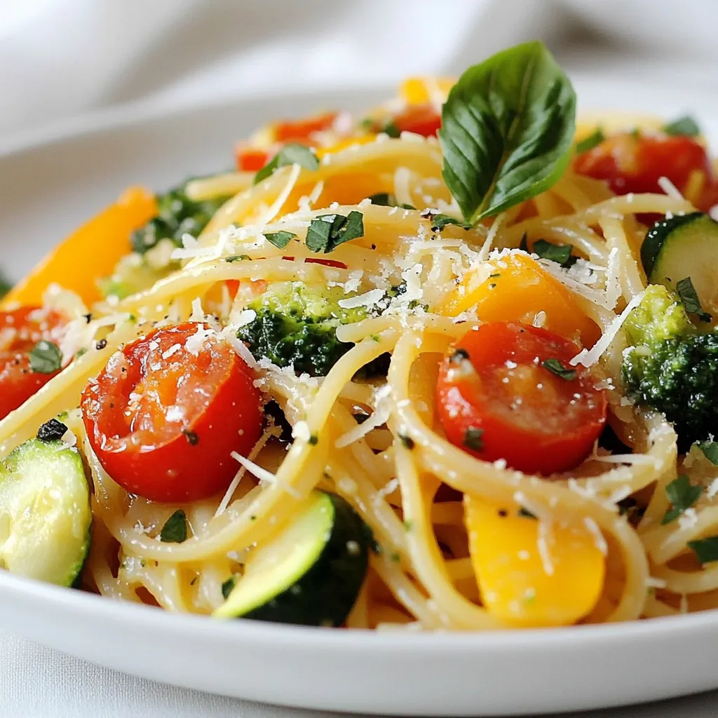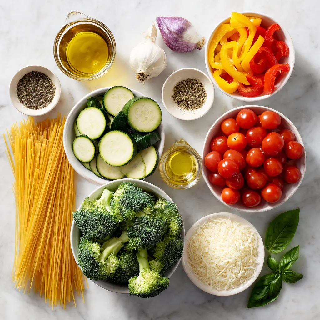 Gather these fresh and vibrant ingredients to create a tasty dish. I love using spaghetti or fettuccine for this recipe. Both types of pasta work well and soak up the flavors nicely. Olive oil adds richness and helps the veggies cook.
