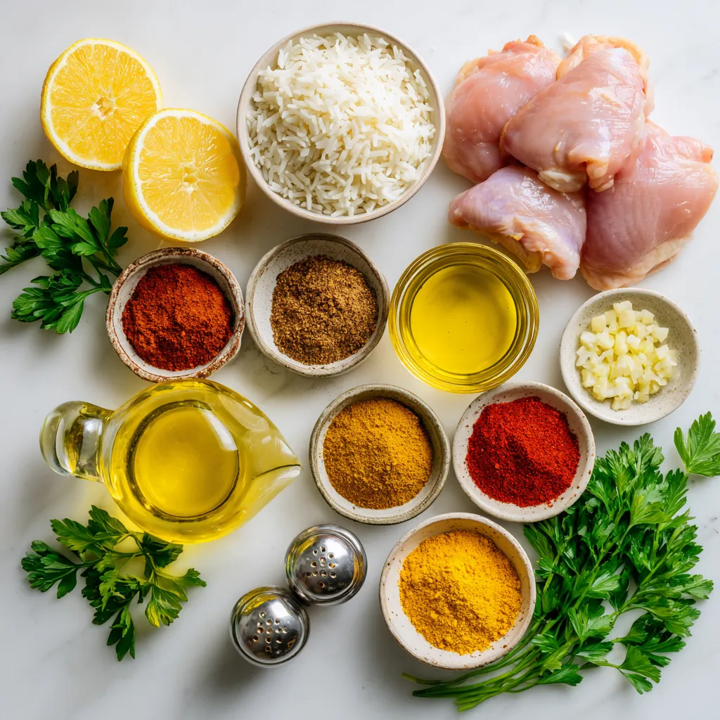 A flavorful one pot meal featuring tender chicken thighs and aromatic basmati rice, seasoned with traditional shawarma spices.