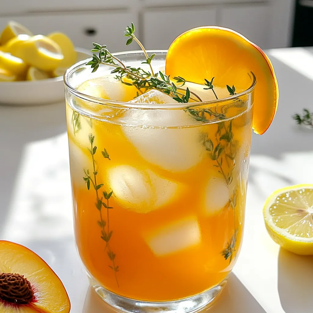 - 4 ripe peaches, pitted and sliced - 4 cups water - 4 green tea bags - 1/4 cup honey or agave syrup (adjust to taste) - 1/4 cup freshly squeezed lemon juice - 1 tablespoon fresh thyme leaves (plus extra for garnish) - Ice cubes - Lemon slices for garnish Gathering the right ingredients is key to making a great Peach Thyme Green Tea Lemonade. First, select ripe peaches. Look for peaches that are soft to the touch, with a sweet smell. These will add the best flavor. Next, you need water. You’ll use it both for boiling and blending the peaches. The green tea bags provide a nice base for the drink. Choose a good quality tea for the best taste. For sweetness, I suggest using honey or agave syrup. Depending on your taste, you can adjust the amount. Fresh lemon juice adds a bright flavor. You’ll want to squeeze it right before using to keep it fresh. The fresh thyme leaves give this drink a unique twist. You can add more for garnish, which looks nice. Finally, don’t forget the ice cubes to keep your drink chilled and refreshing. With these ingredients, you’ll be ready to make a delicious summer drink. Enjoy the process and the amazing flavors that come together! - First, bring 2 cups of water to a boil in a medium saucepan. - Once it boils, remove it from heat. Add 4 green tea bags and 1 tablespoon of fresh thyme leaves. - Let this steep for about 5 minutes. This step draws out the tea's flavor and the thyme's aroma. - While the tea is steeping, slice 4 ripe peaches and place them in a blender. - Add the remaining 2 cups of water to the blender. Blend until the mixture is smooth. - Next, strain this mixture through a fine-mesh sieve. This gets rid of any pulp, leaving just the juice. - After steeping, remove the tea bags from the pot. While the tea is still warm, add 1/4 cup of honey or agave syrup. Stir until fully dissolved. - In a large pitcher, mix the peach juice, sweetened tea, and 1/4 cup of freshly squeezed lemon juice. Stir well to blend the flavors together. - Chill your drink in the refrigerator for at least 30 minutes. This helps it taste even better. - When ready to serve, pour the peach thyme green tea lemonade over ice in glasses. - Finish it off by garnishing with thyme leaves and lemon slices. This adds a nice touch and makes it even more refreshing. To get the right sweetness, start with honey or agave. Use 1/4 cup as a base. Taste it after mixing. If it's too sweet, add more water. If it’s not sweet enough, add more honey. You can also try maple syrup or stevia for fun twists. Each sweetener brings its unique taste. Your drink can shine with extra herbs. Try mint or basil for a fresh kick. These herbs add depth to your lemonade. You can also toss in fresh fruit slices. Strawberries or raspberries look great and taste amazing. They add color and fun to your drink. When you pick peaches, look for ripe ones. They should feel soft but not mushy. The color should be bright and warm. Check for sweet scents; it means they are fresh. Avoid any that have bruises or dark spots. Fresh peaches make the best peach thyme green tea lemonade. {{image_2}} You can change the peaches for other fruits. Strawberries and raspberries work great. Just blend them like the peaches. Use the same amount of fruit for the best taste. Each fruit brings its own flavor. For example, strawberries add a sweet touch. Raspberries give a nice tartness. Feel free to mix and match for fun! While green tea is refreshing, you can try other teas too. Herbal teas like chamomile or hibiscus can add unique flavors. Cold brew tea is another option. It tastes smooth and rich. Just steep your tea bags in cold water overnight. This way, you get a gentle flavor without bitterness. Want to make a peach thyme cocktail? It's easy! Just add a spirit like vodka or gin. Start with 1.5 ounces per glass. Mix it with your peach thyme drink. It adds a fun zing for parties. You can also try rum for a tropical touch. Cheers to delicious summer drinks! To keep your Peach Thyme Green Tea Lemonade fresh, always store it in the fridge. Use a clean, airtight container for the best results. This drink will stay fresh for up to three days. After that, the flavors may fade. You can freeze the peach juice if you want to save it for later. Pour the juice into ice cube trays or freezer bags. This way, you can use it for future drinks or smoothies. It will last in the freezer for up to three months. I recommend using glass jars or BPA-free plastic containers. These are great for keeping your drink fresh. Make sure they seal tightly to prevent air from getting in. This keeps your Peach Thyme Green Tea Lemonade as tasty as when you first made it. Green tea is rich in antioxidants. These help fight free radicals in your body. This means they may lower your risk of some diseases. For example, green tea may support heart health and aid in weight loss. Some studies suggest it can improve brain function too. Drinking green tea may boost your metabolism. This is great if you want a refreshing drink that also helps your health. Yes, you can make this recipe vegan. Simply swap honey for agave syrup or maple syrup. Both work well and keep the drink sweet. You can also use any sweetener you like. Just adjust the amount to your taste. For a vegan-friendly twist, try using fresh, organic ingredients. This ensures your drink is not only tasty but also pure and healthy. You can keep this drink in the fridge for up to three days. Make sure to store it in an airtight container. This helps keep the flavors fresh. For the best taste, drink it within the first two days. If you notice any change in color or smell, it’s best to toss it. Enjoy your Peach Thyme Green Tea Lemonade while it's fresh and tasty! This blog post explored how to make a refreshing Peach Thyme Green Tea Lemonade. First, we covered the simple ingredients, like ripe peaches and fresh thyme. Next, I shared step-by-step instructions from boiling water to serving the drink over ice. You learn