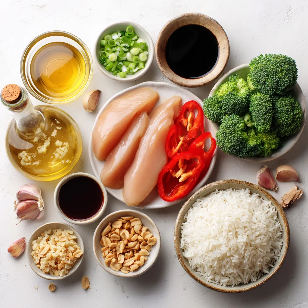 First, gather your ingredients. You need chicken, peanut oil, onion, garlic, ginger, bell pepper, broccoli, peanut butter, soy sauce, honey, rice vinegar, sriracha, chicken broth, green onions, and crushed peanuts.