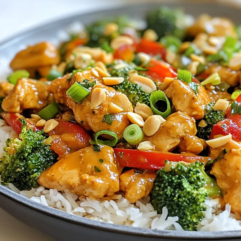 • Return the cooked chicken to the skillet and pour the peanut sauce over the chicken and vegetables. Stir well to coat everything in the sauce. Cook for another 2-3 minutes to heat through.