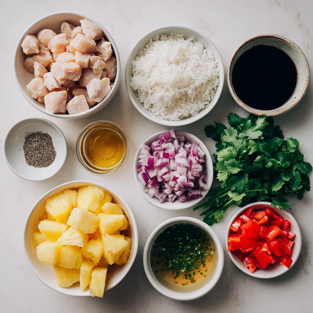 A delicious and vibrant dish featuring chicken, pineapple, and jasmine rice, perfect for a tropical-inspired meal.