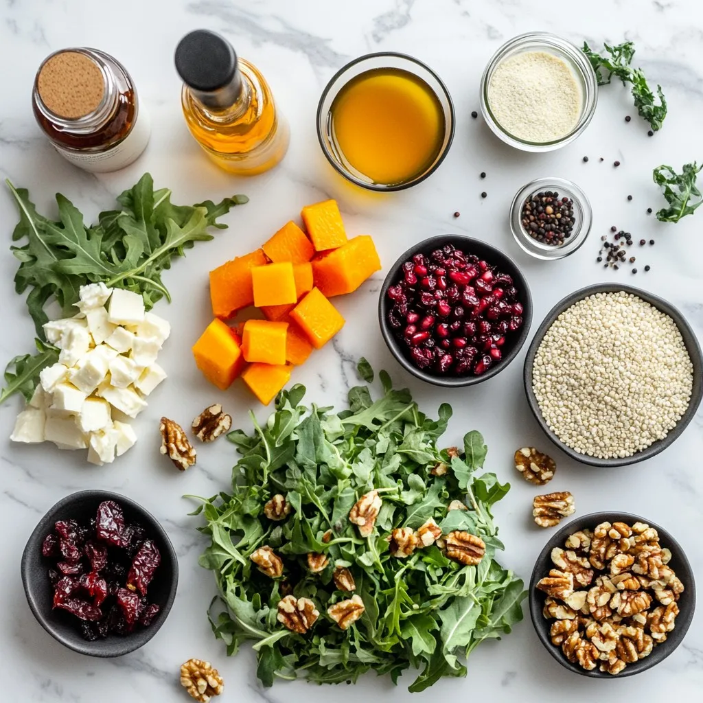 Each ingredient adds a unique flavor and texture. The salad greens are crisp and fresh. Quinoa adds protein and a nice chew. Butternut squash brings warmth and sweetness. Pomegranate seeds add a juicy burst of flavor. Feta cheese gives a creamy touch. Walnuts add crunch, while cranberries offer a hint of tartness.